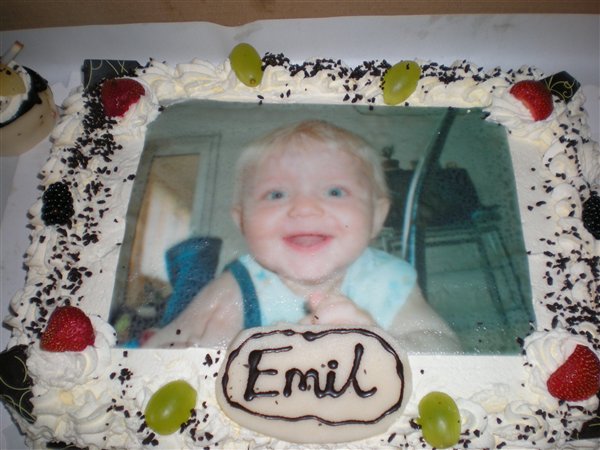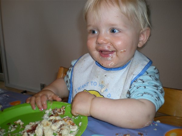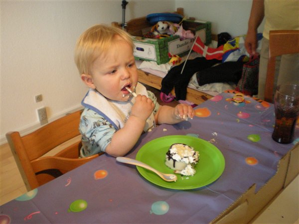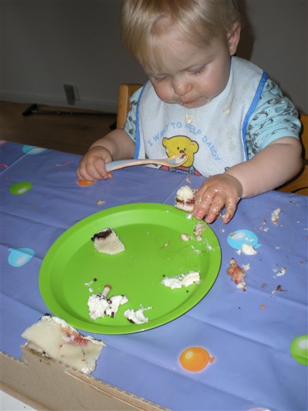 Han spiste godt med lagkage, kan huske vi var et par stykker herinde som mente at det med at de fik deres egen lagkage ik betød så meget når de jo alligevel nok smed det meste på gulvet..... Den holder ik længere, Emil guflede bare løs, den smagte vildt godt, han spiste mere end han smed på gulvet