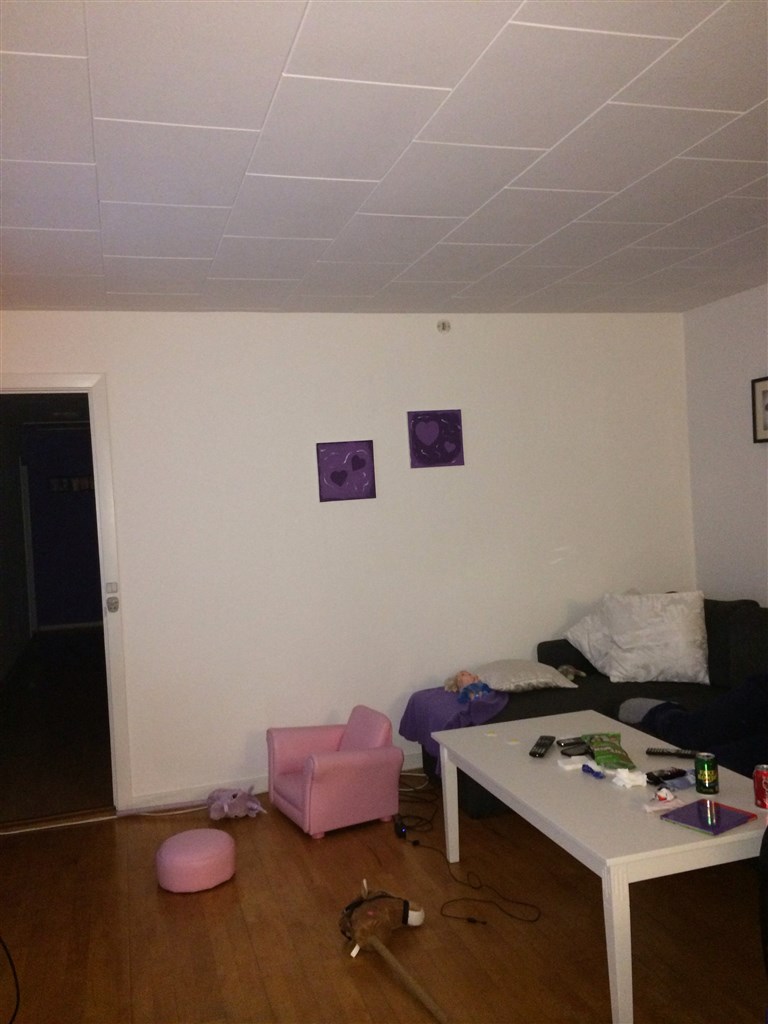 Hænge et par store billeder op med lidt farve på, ved spisebordet og over ved sofabordet.