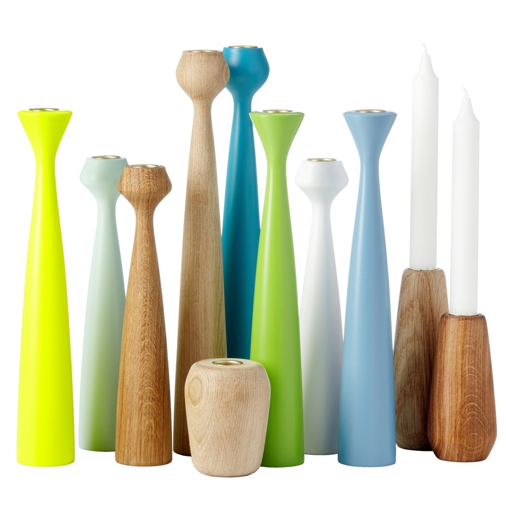 Nogle lysestager til lange lys, stående i vinduet, og på svævehylderne.