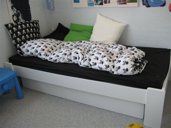 Han synes bare den nye seng er for fed - og så fik han også en voksendyne med dødningehoved betræk !! Hvis du spørger mig er det hæsligt, men drenge ville gerne have noget farligt (da manden spurgte efter evt motiv) og det var så det mest farlige han kunne finde