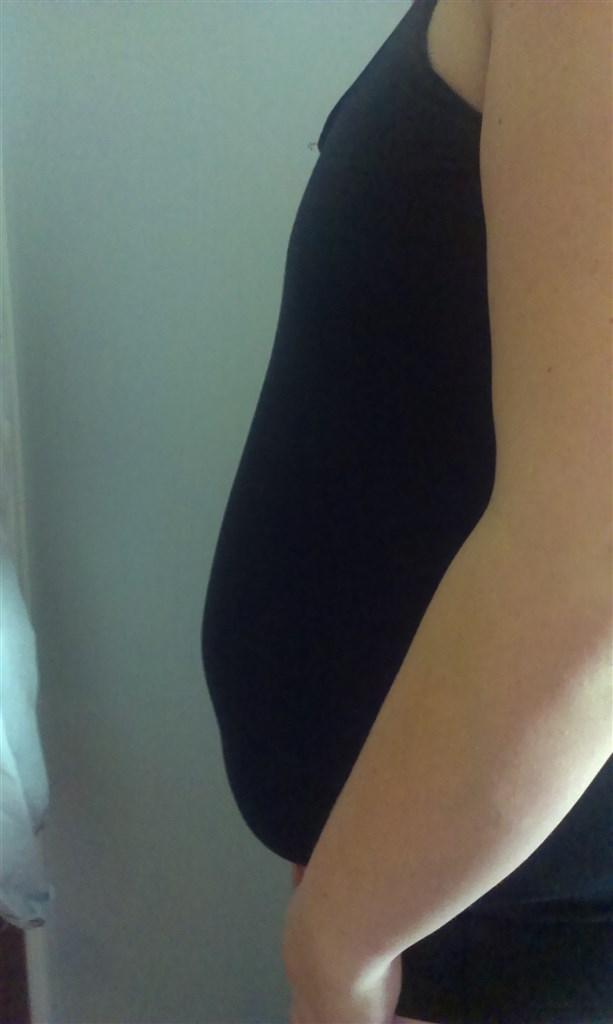 Er enig - det er lidt svært nrå der ikke er et før billede, men hvis jeg tænker i forhold til mine egne graviditeter (og så gå rjeg ud fra at du er første gangs gravid?), så vil jeg sige du er.. 14+ ?