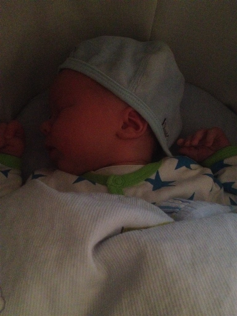 Var til scanning da Jordemoder mente han var meget stor. Scanningen igår målte ham til 4758g, blev tjekket og var åben nok til de kunne tage vandet (15.55). Det hele gik meget hurtigt og smertefuldt, men 2 timer og 20 min senere kom et "lille nips" ud på 53 cm og 4050g, 30g mere end storebror