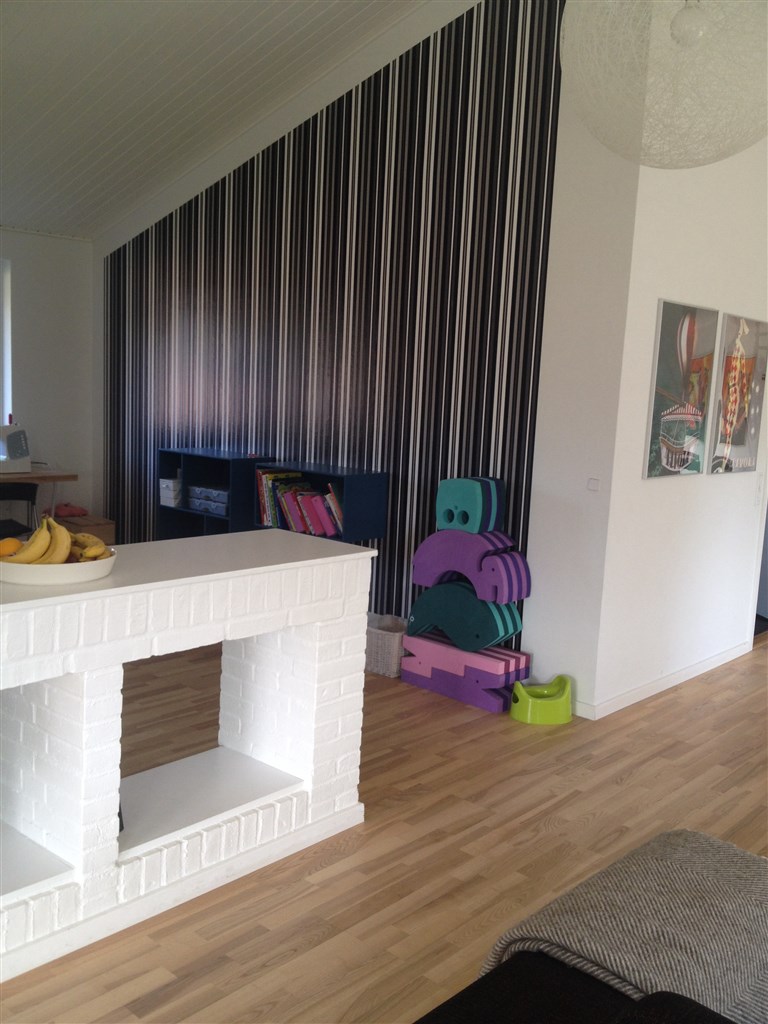 Vi havde sort/hvid stribet i lejligheden i stuen det var rigtig fint... ;-) Nu hvor vi er flyttet i hus har jeg malet væggen lysgrå, for at skabe en rolig stemning, grå står godt til alle farver og er meget rolig... ;-)