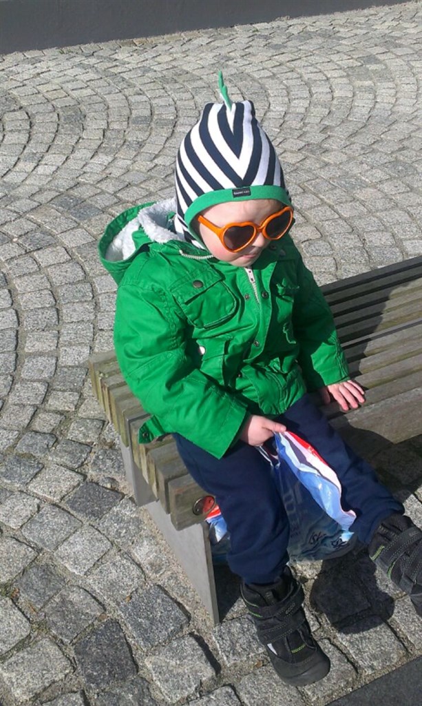 Min mor har Elias i et par dage Rigtig hygge dage Hun har så lige sendt det her billede til mig, han har hvis fået nye solbriller Er han ikke bare en chamere ??