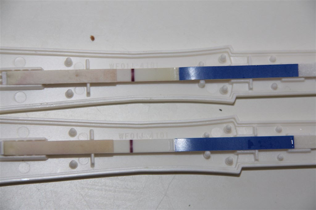 Måske jeg bare er blevet tyk på maven? I sidste uge sagde min mand det til mig, så tænkte "nu tager jeg sgu en test" Den var svag - som meget svag positiv (øverst på billedet), så ventede et par dage, og der var den negativ (nederst på billedet) Så er jeg vel ikke gravid?