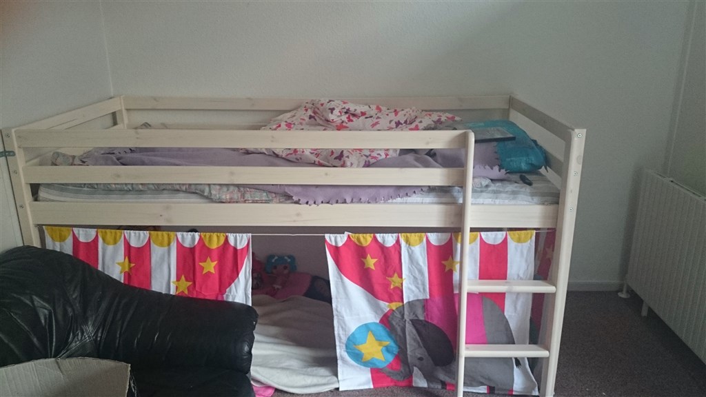 Vi har dog syet nye gardiner til den da de der er på slet ikk passer til en pige på næsten 5. Under sengen er der lagt en bedres og masser dyner, tæpper og puder. Skal ha hængt noget op der inde har bare ikke fundet det helt rigtige endnu.