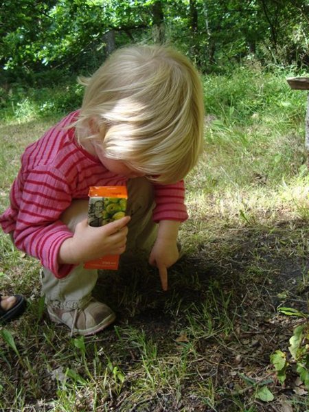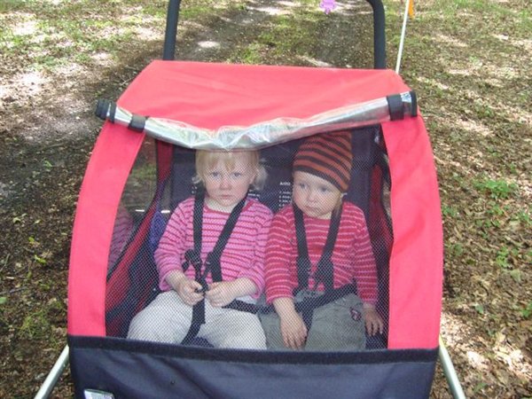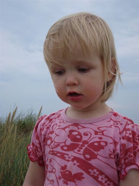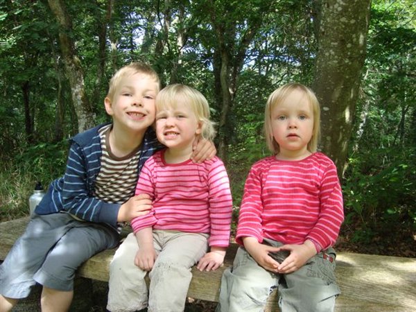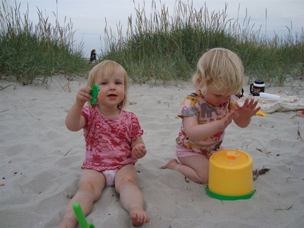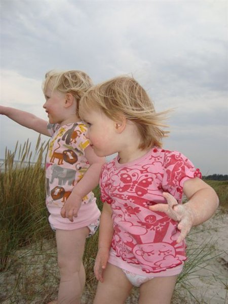OBS. Nanna har selv valgt at have storebrors hue på denne varme august-dag, og ve den, der ville tage den fra hende! Desuden vil hun da under ingen omstændigheder smile på kommando. Signe smiler derimod lige så snart man tager kameraet op af lommen, hvis hun da ikke er i færd med at få de store skovmyrer til at kravle op på fingeren.