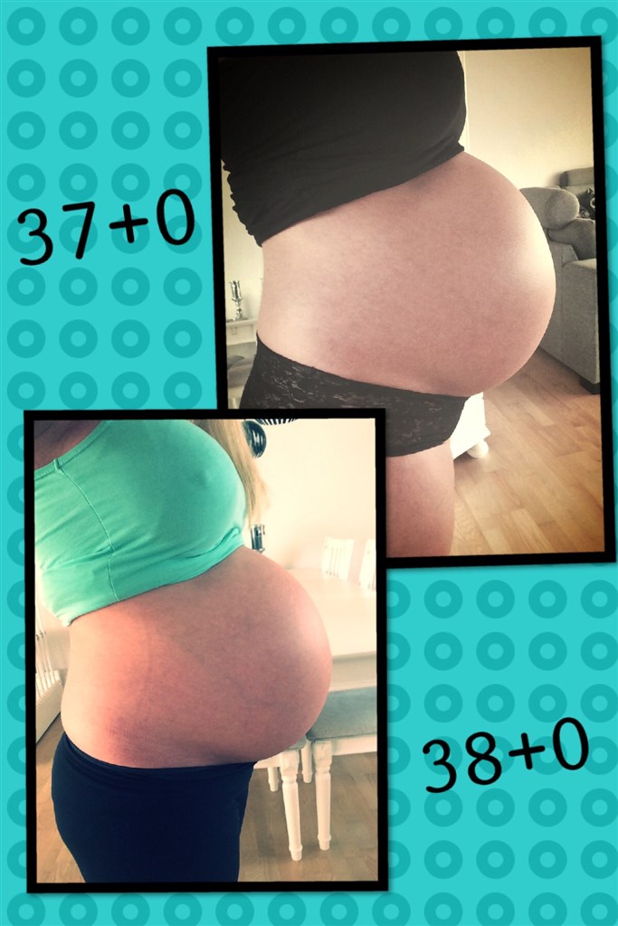 Var ved jdm i torsdags og der var hendes skøn af ham 2800 g. Så en lille bitte smule under gns. Men det er jo bare et skøn, så nu må vi se. Og så står han ikke fast endnu, men har hovedet nedad og står ikke unormalt højt. Og ved at sammenligne maven fra uge 37 til uge 38 kan man da også se, at maven ihvertfald ikke er sunket. Har også stadig svært ved at få vejret engang imellem.