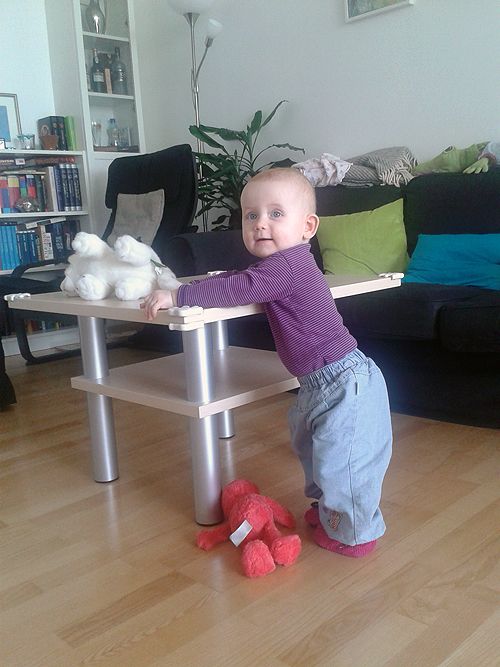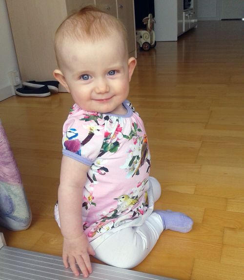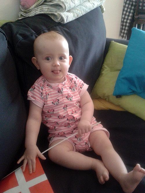 Selvom det har været et lidt hårdt forår for hende, men lungebetændelse og slem mellemørebetændelse (var indlagt på sygehuset begge gange), så klarer hun det flot! Hun går ikke endnu - men hun har bevæget sig fremad siden hun var 9 mdr og er for nyligt også begyndt at kravle "rigtigt". Hun rejser sig også op ved ting, men er ikke så modig medmindre der virkelig er god lokkemad (såsom en fjernbetjening, en telefon eller yndlings-nussekluden). Det gør jo lidt ondt når man endnu ikke er helt sikker på at sætte sig ned igen. Hun har ca. 5 tænder og mindst 2 mere på vej, går i vuggestue og vi får altid at vide hun har haft en god dag og hygger sig. Hun pludrer ud i ét væk og siger "mam/mad", "mmm" og "kat" og muligvis også et par ord mere, som vi ikke er helt sikre på endnu. Hun er næsten altid i godt humør og ude på ballade, men elsker også at komme op lige og kramme mor eller far lidt, før man skal videre i legen