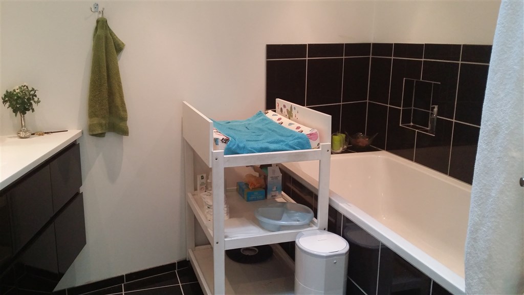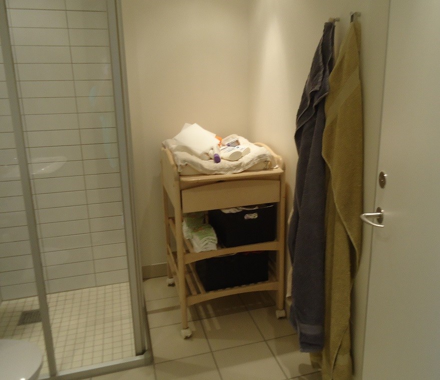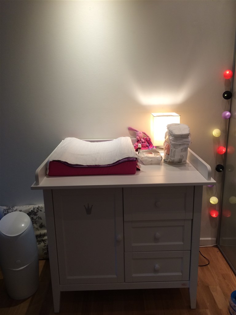 Jeg har dette puslebord - billedet er taget lige efter vi fik renoveret badeværelset, så derfor rod på puslebordet