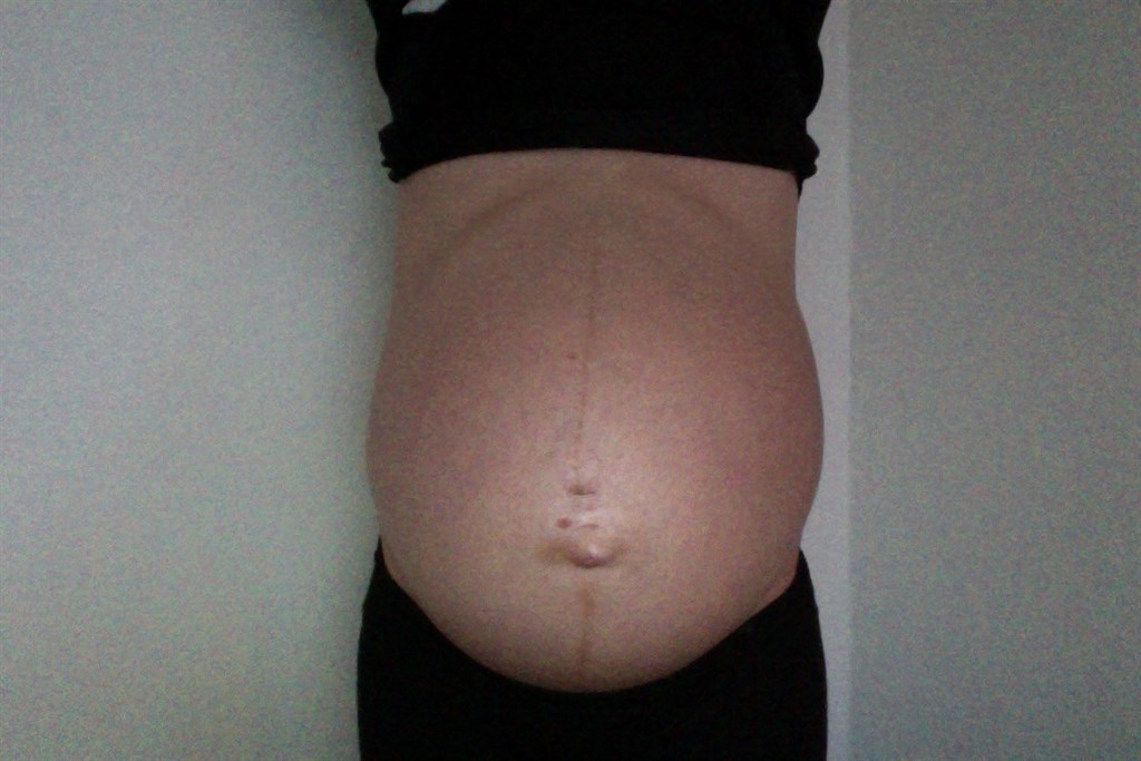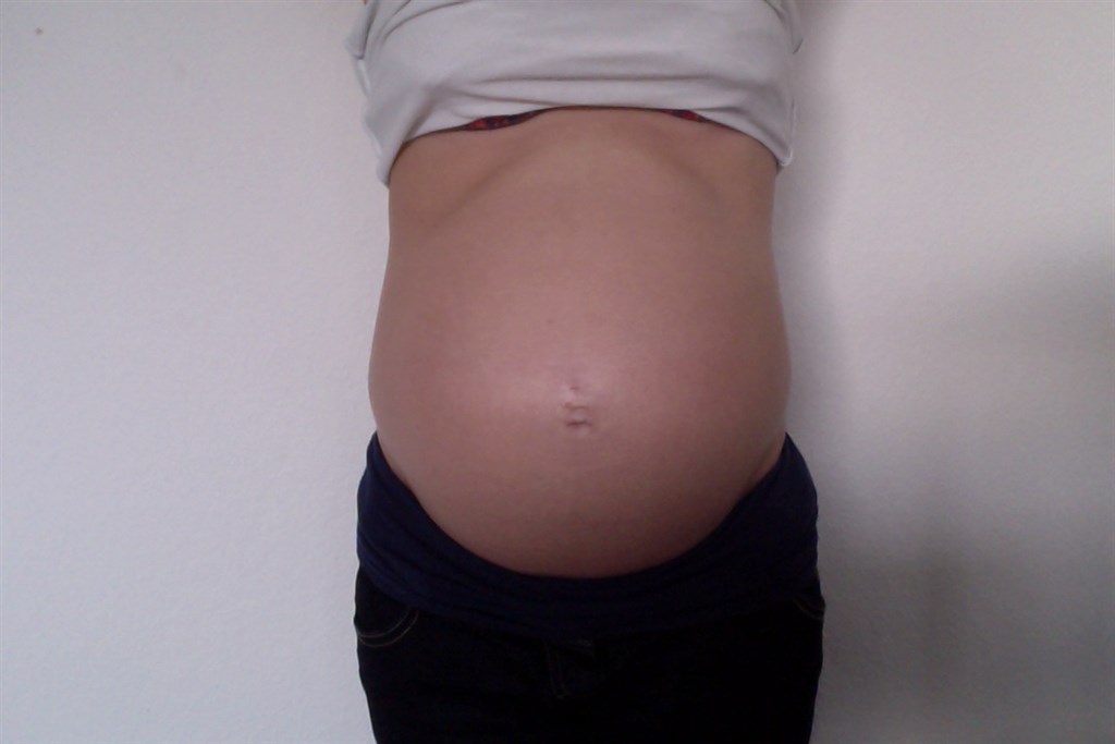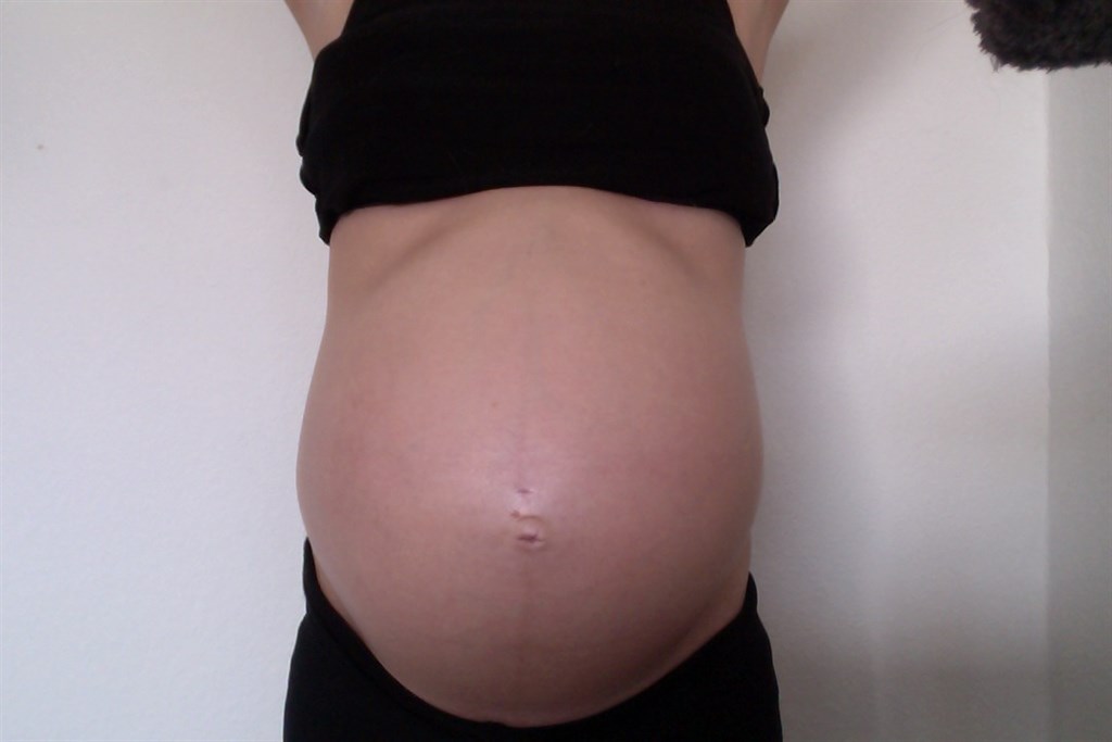 Min blev først synlig lige efter fødslen (eller jeg/vi opdagede den i hvert fald ikke før, men den har jo nok været der, og bare været lidt utydelig på den udspilede mave), og derefter var den der i et par måneder efter, mener jeg