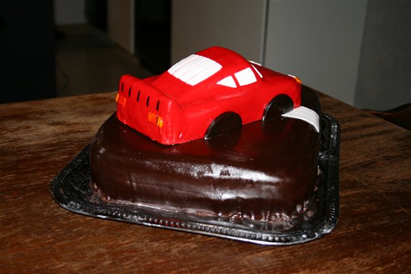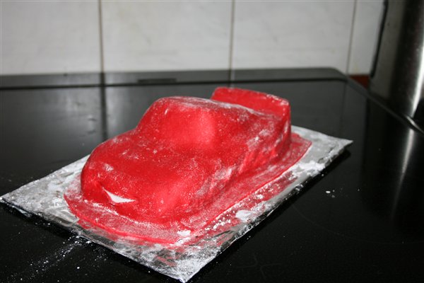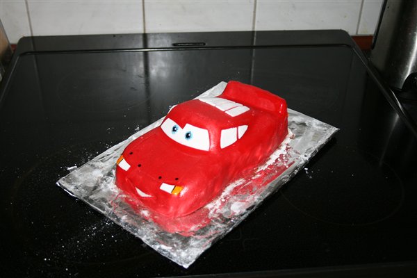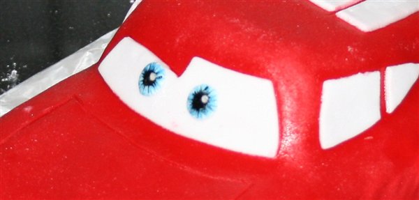 ja jeg har malet/ skrevet med sort pastafarve og en pensel. både på øjne lygter, navn og det sorte foran og bagpå bilen. men det smidter af...! øv, så jeg kunne ikke engang betrække kagen med vitawrap, for det hang ved og tværede ud!!