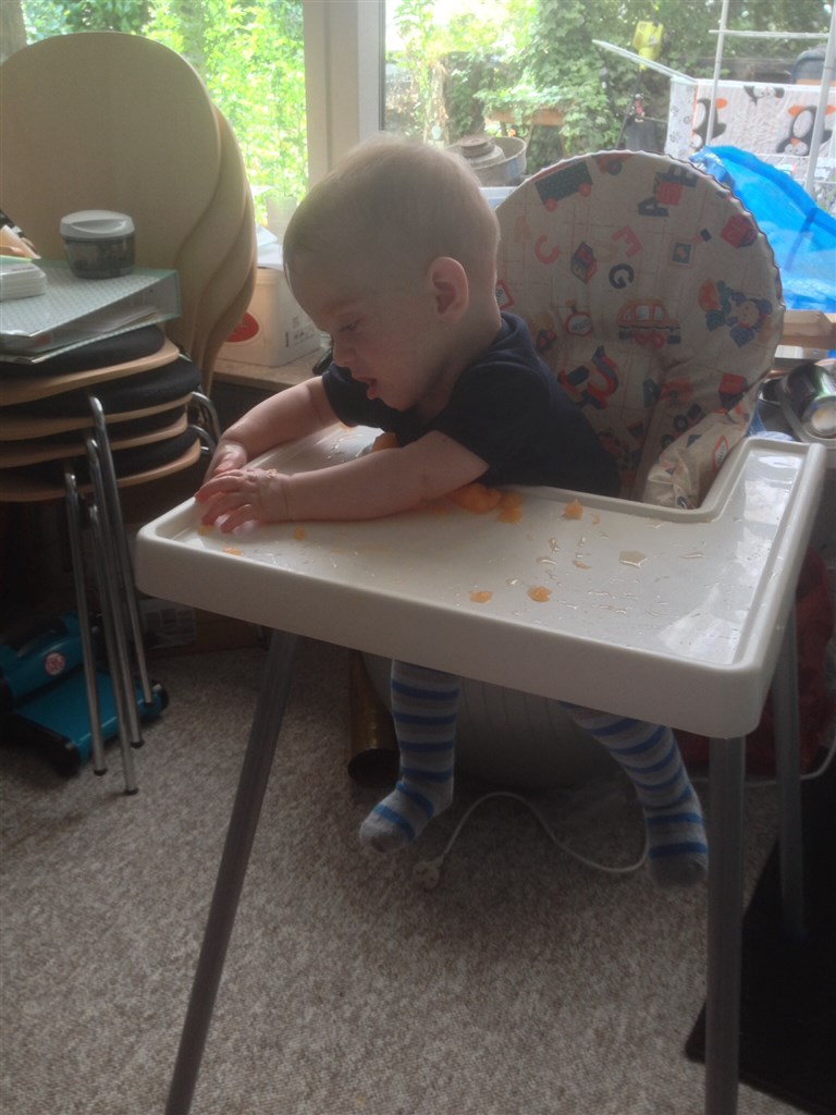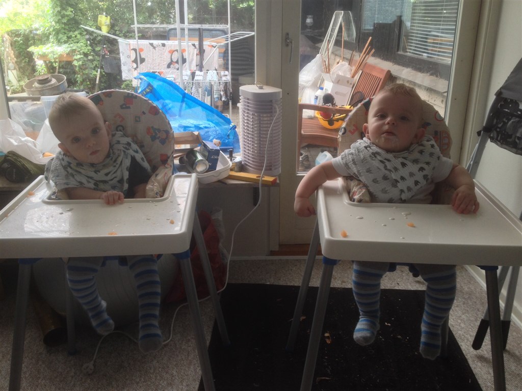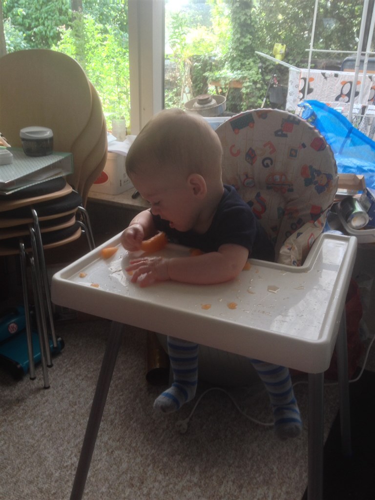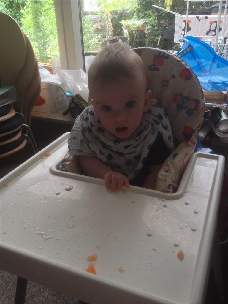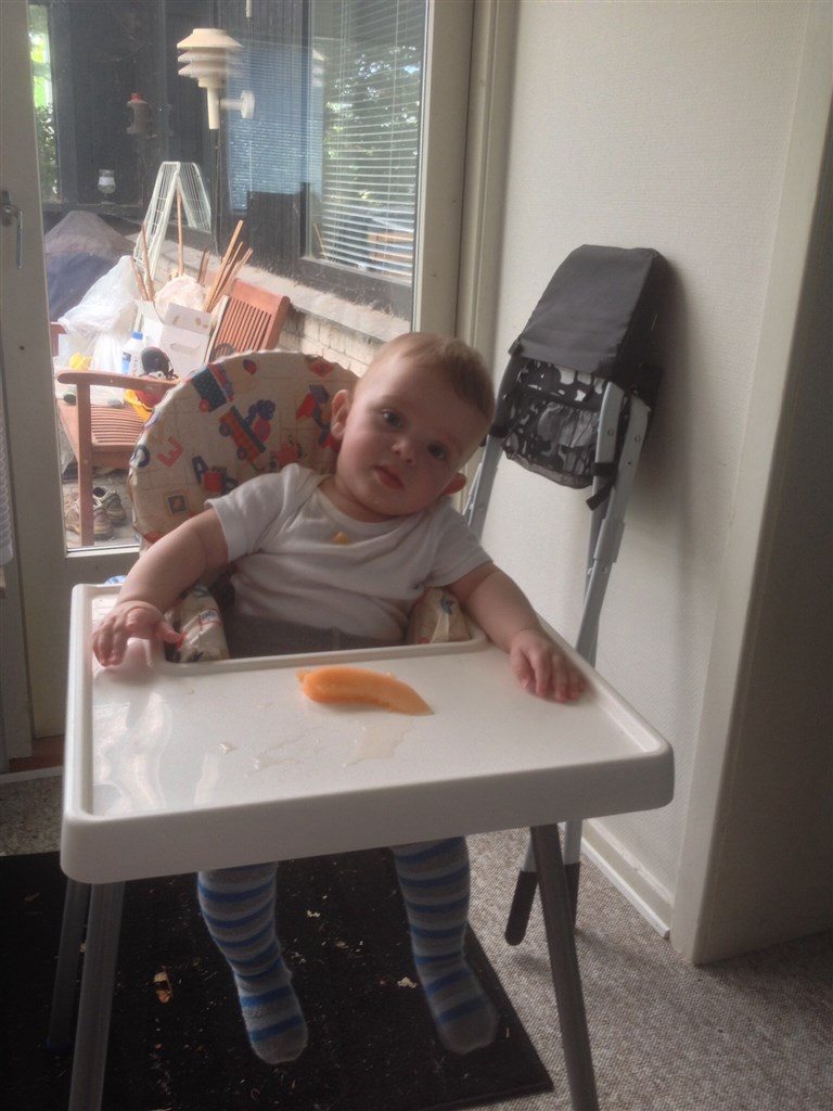 Og de spiser skemad og er lige begyndt at sidde med frugt og grønt og spise selv..
