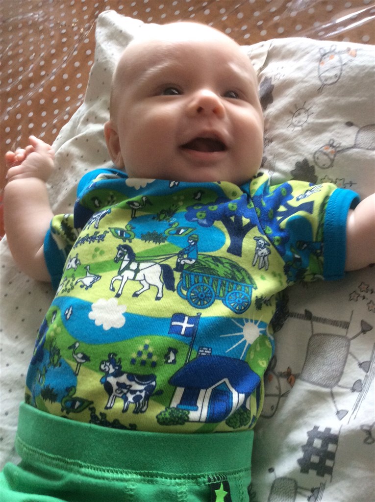 han er ikke af den slags der sover ret meget om dagen og har været noget vrøvlet .. Men nu er han meget mere opmærksom og smiler og pludrer .. Har opdaget arme og ben at de kan sprælle og gøre sjove ting.