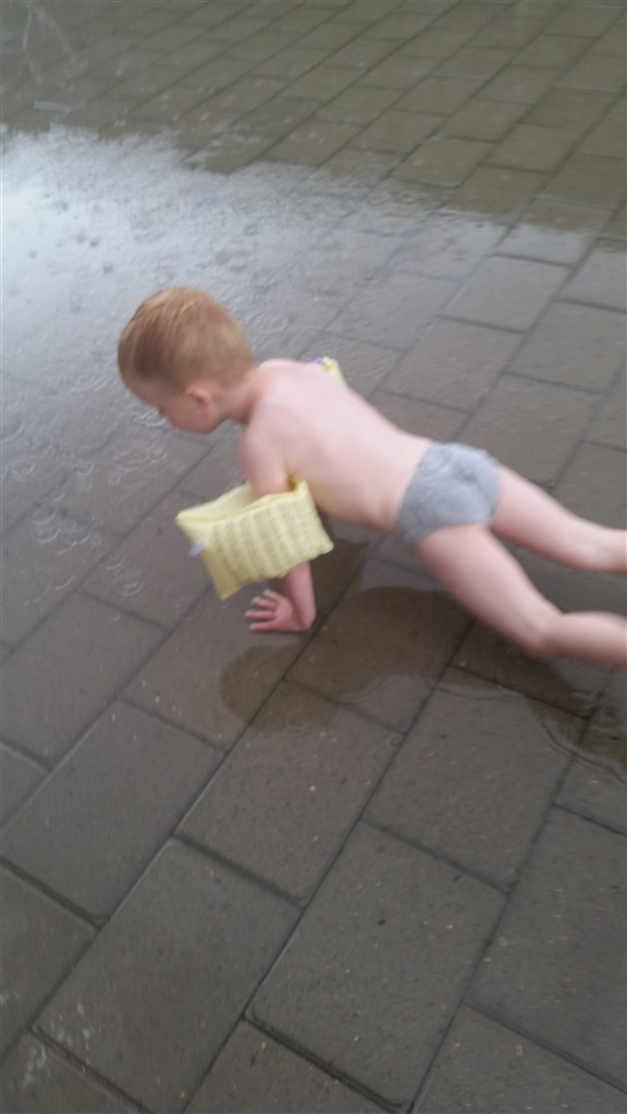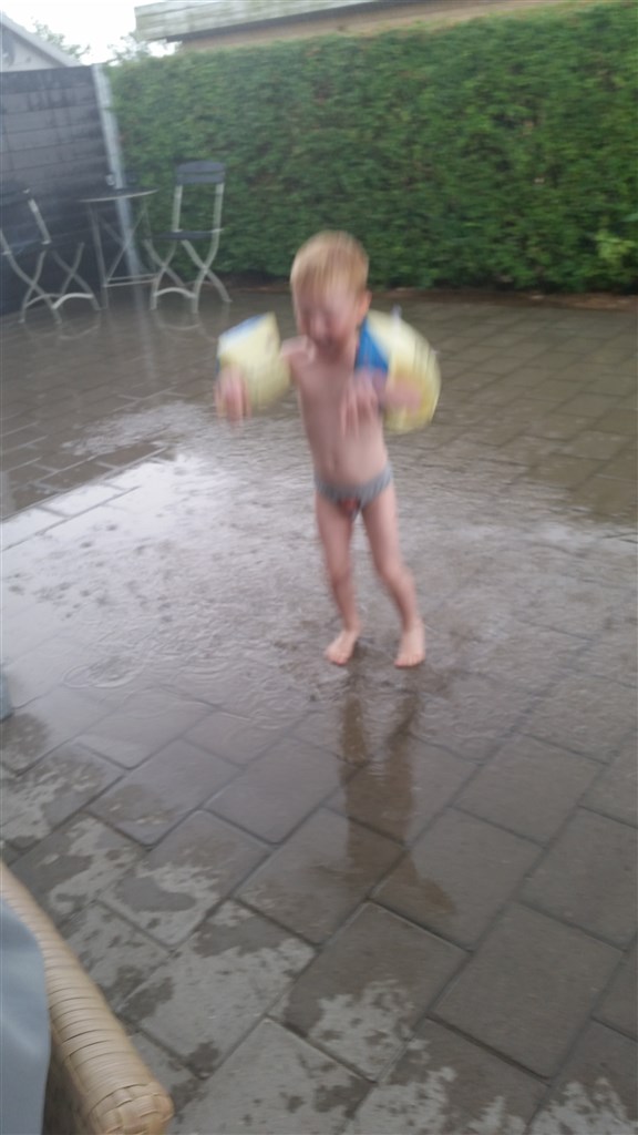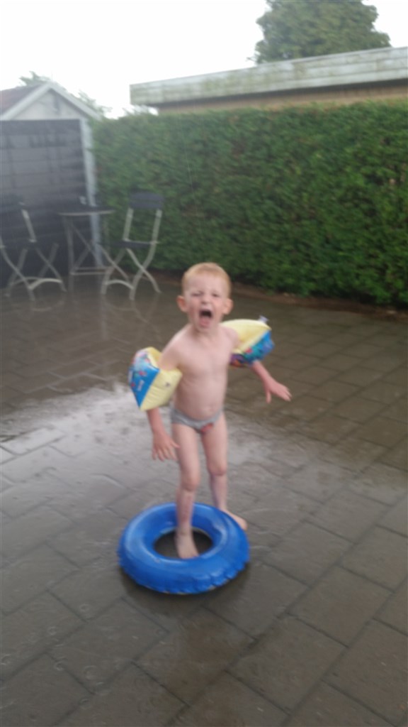 Elias ville lege i regnen men man skal ha arm-vinger på når man bader Tosse knægt