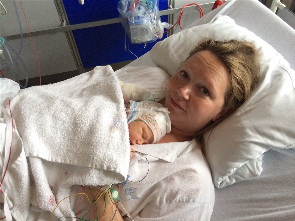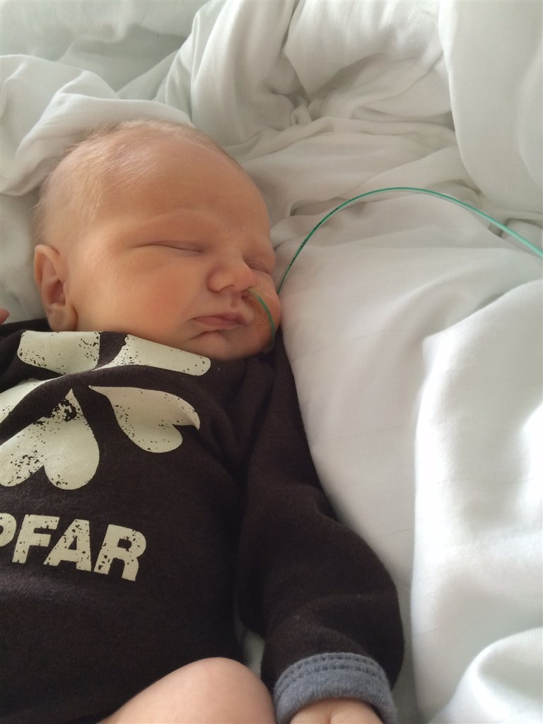 Det første billed af ham og jeg, er han ca 16 timer gammel, det er første gang jeg får ham over, og han har fået en pose blod, men er stadig ret bleg, og så er billedet fra ca kl 6 om morgenen