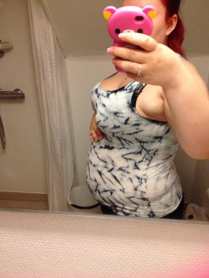 Er begyndt med kvalme 24/7, hedeture, humørsvingninger, mine bryster føles tunge og lidt murren i underlivet, og min mave er utrolig oppustet.