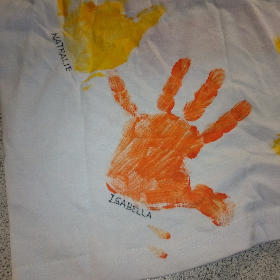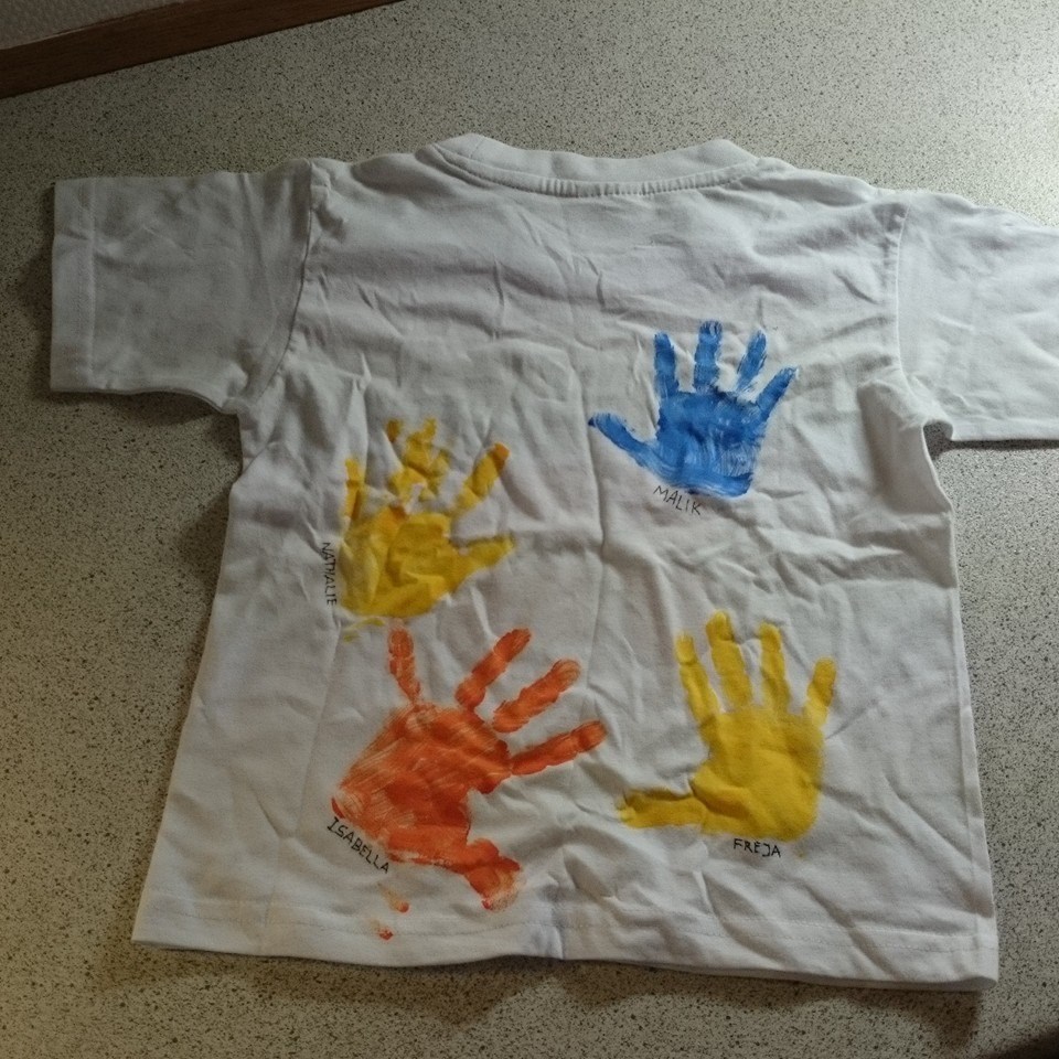Da vi hentede ham i vuggestuen i går havde han fået en fødselsdagsgave De havde lånt storesøster i børnehaven, så hun havde fået sin hånd med på trøjen