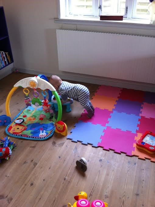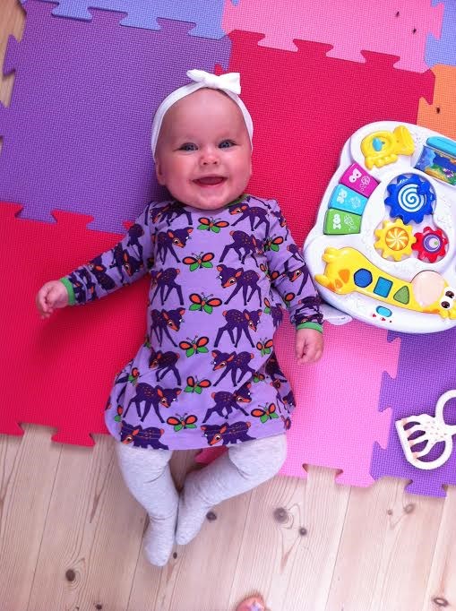 Hun er 66 cm lang og vejer 7,8 kg. Så hun er en skøn lille prop. Hun er overalt! Kravler, skubber sig frem med ting, sidder selv og er skide dygtig til at spise. Hun kan bare så meget, synes jeg! Og en smule billeder.