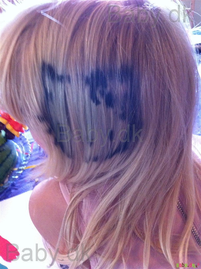 Thea og far har tegnet skabeloner hele weekenden, så det blev både til store og små stjerner, sommerfugl, flag, hjerter, stjerneskud og hallo kitty. Tegn det på pap og skær det ud, hold papet tæt indtil håret og spray med farven. Vh stine