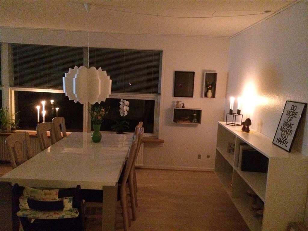 Man har måske ikke så meget stående på et spisebord? Jeg savne sådan noget som stearinlys og blomster på bordet udover frugtskålen men ved ikke om det så vil blive for meget af det gode?