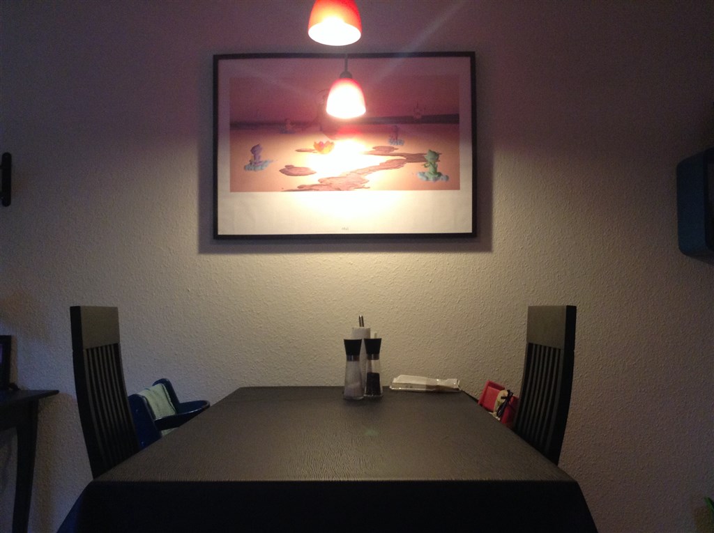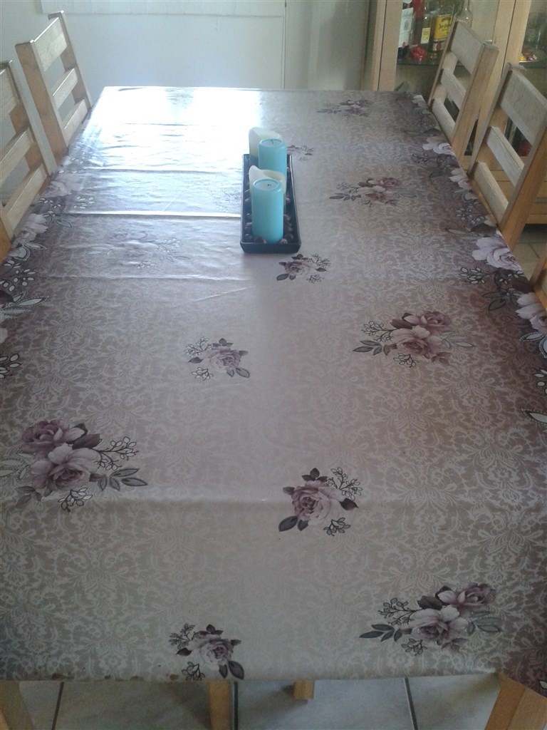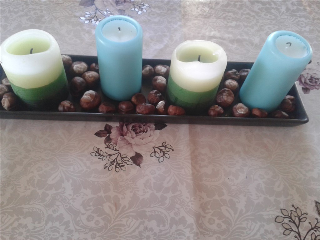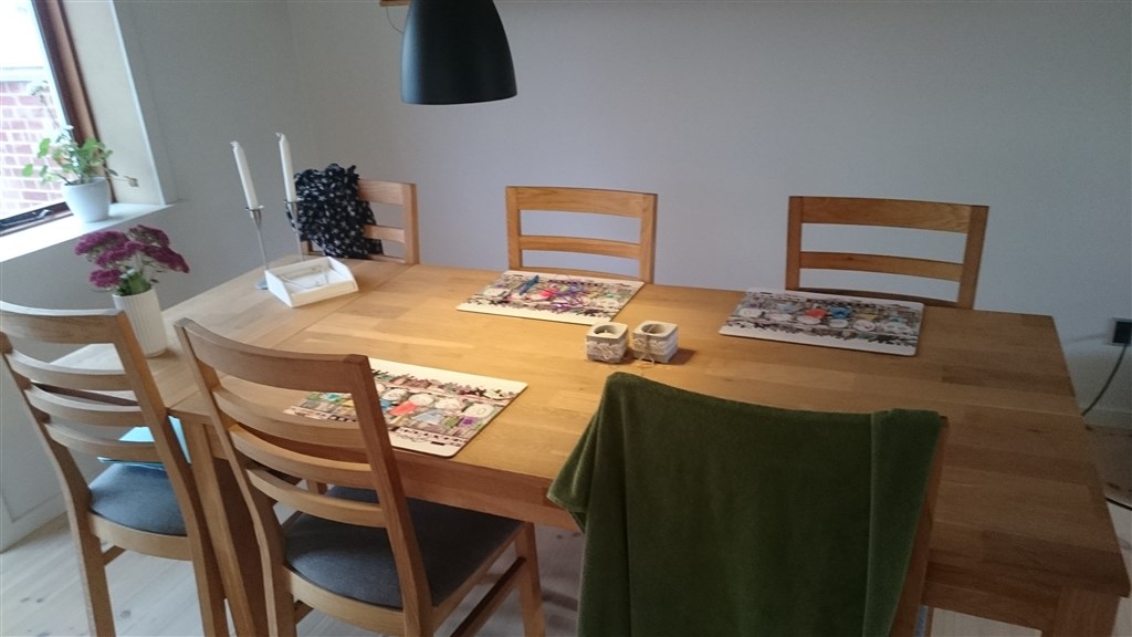 Jeg har ikke noget billede, men stort set ligger der en løber i bunden, fordi jeg godt kan lide at have lidt farve i rummet. Ovenpå sætter jeg ofte stearinlys i en eller anden form, særlig nu da vi nærmer os mørkere aftner osv. Ud over det ligger der som regel noget i stil med en pippibog, en skål perler, farveblyanter, et blad osvosvosv. Jeg kan rydde op så mange gange, jeg bare gidder, men det tager næsten ingen tid, før "nogen" igen har siddet ved bordet eller lagt noget fra sig der.....