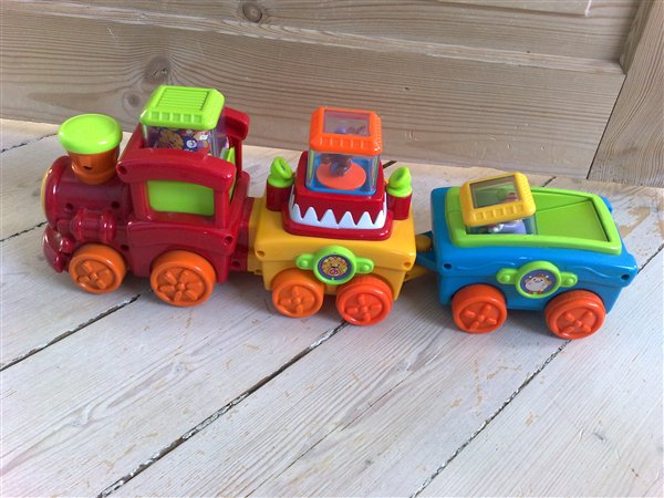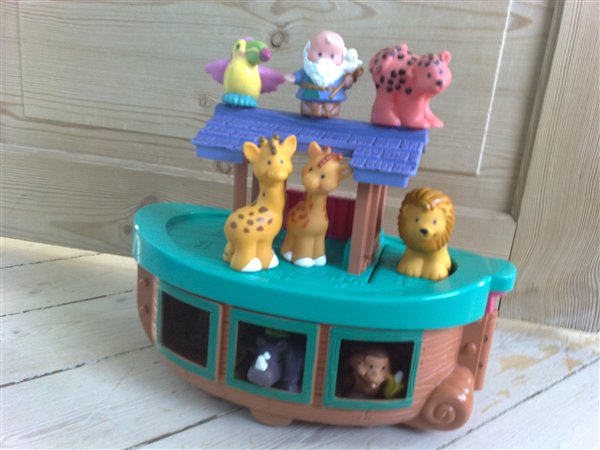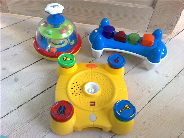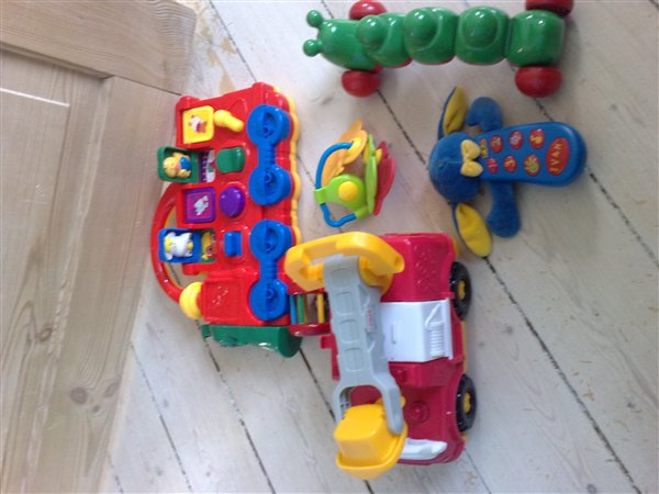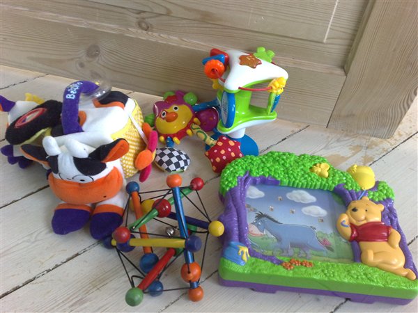 Sækkene indeholder blandt andet Noahs Ark fra Fisherprice, selvkørende tog fra fisherprice, selvkørende traktor, avancerede rangler, klovnedukke, trælegeplade fra Brio samt en masse andet spændende babylegetøj.