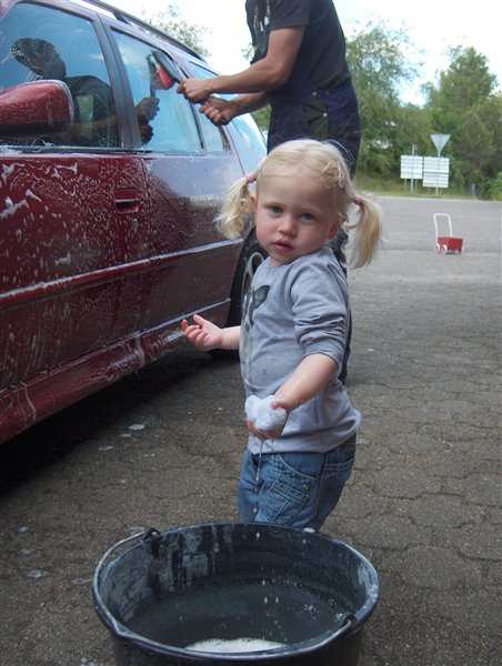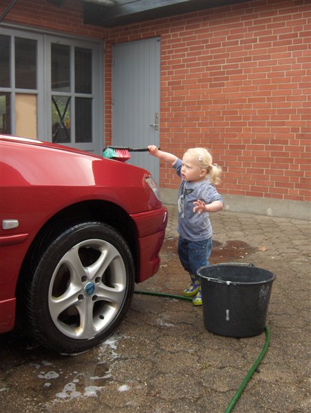 Emily blev imorges iklædt tøj og gummistøvler. Inden længe drønede hun rundt i bare tæer. Jeg puttede hende i sandaler hvorefter hun max en halv time senere havde afklædt sig både sandaler, bukser og trøje. Altså kun iført ble og body. Jeg kan nu igen gå ud og klæde hende på men jeg ved at hun tager det af inden der er gået ret lang tid.