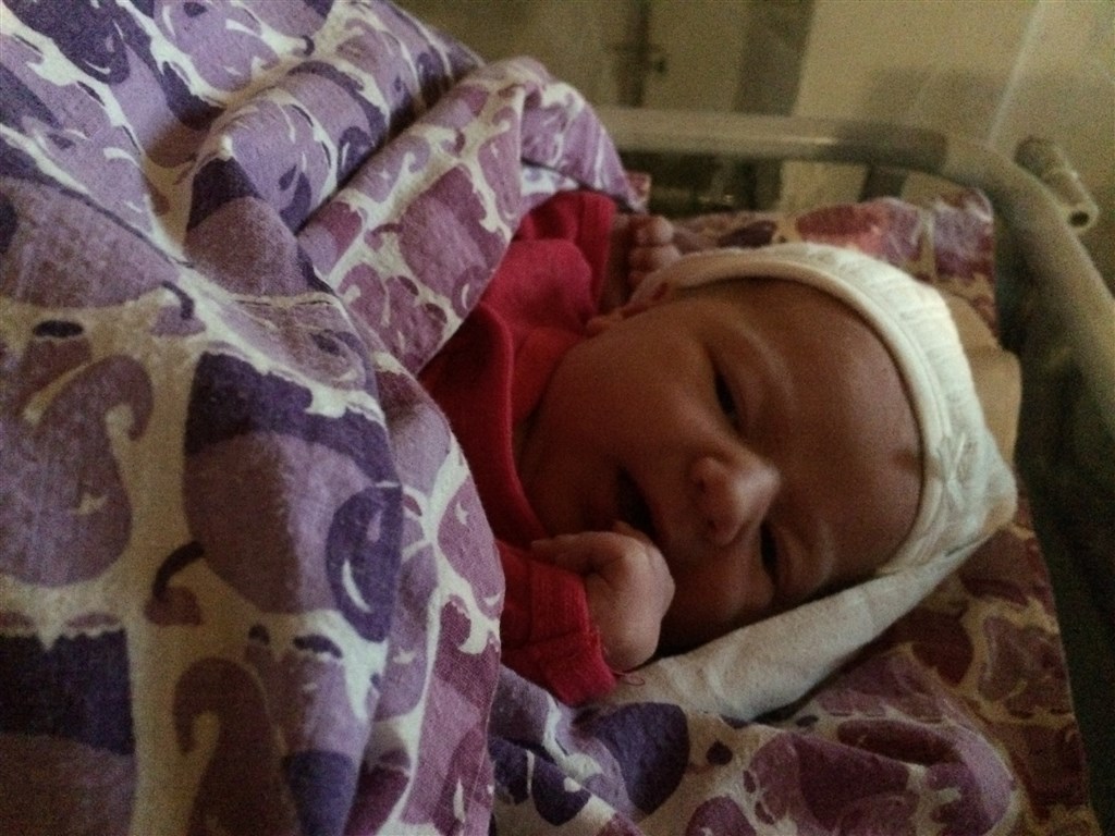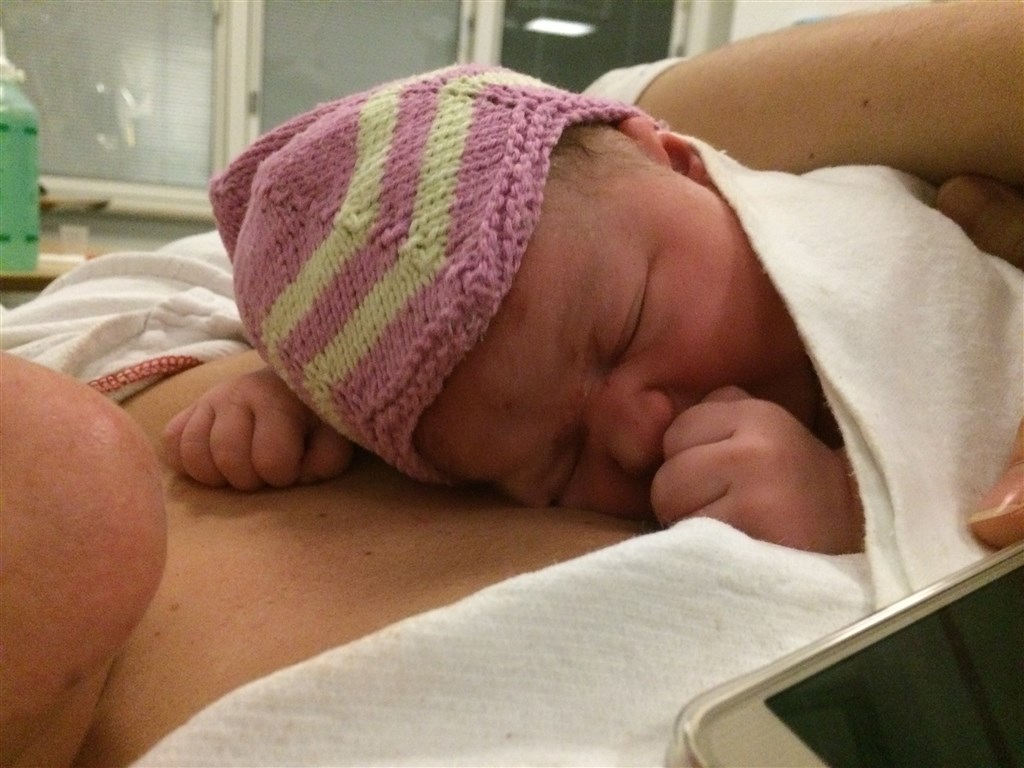 Mor her er meget træt efter fødslen og efter at have haft for højt blodtryk og ondt i hovedet hele natten.. Fødslen tog ikke mere end 5 timer fra da vandet gik derhjemme kl. 15.00 til lillepigen var ude kl. 20.10.