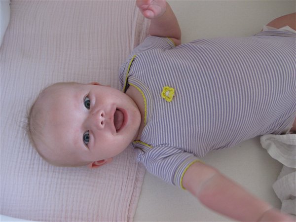 Alt var som det skulle være og Lina vejer nu 8200 g og 70 cm - en stor pige. Hun ser ud til, at være ældre end 5 mdr. grundet hendes størrelse. Men længde og vægt passer sammen, og det er jo det vigtigste. Så har hun også fået "elastikker" og det er kun charmerende til babyer.