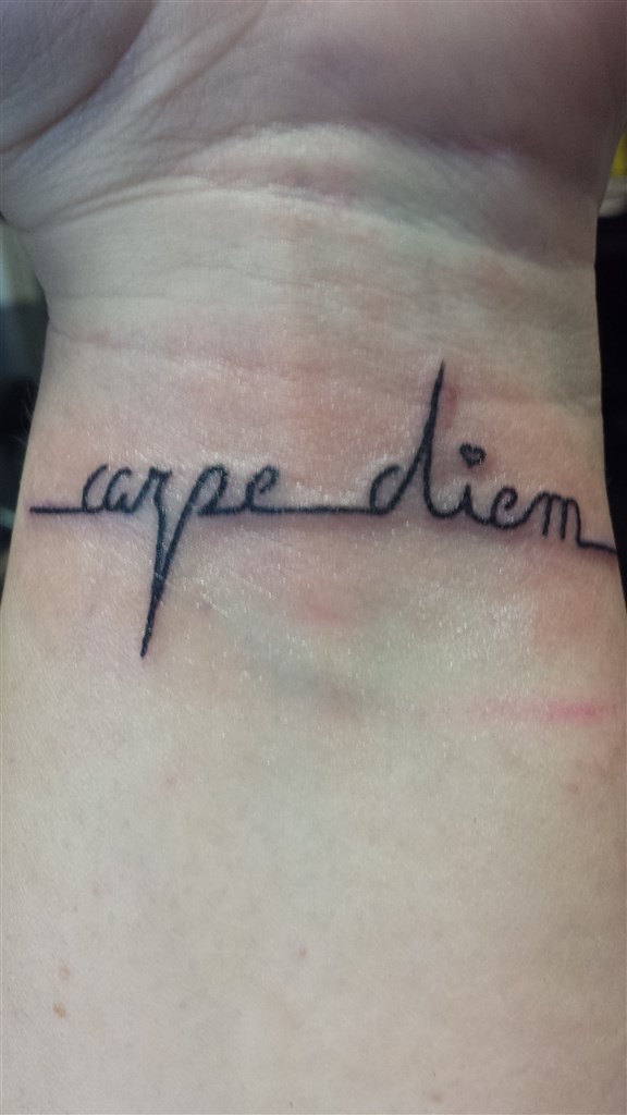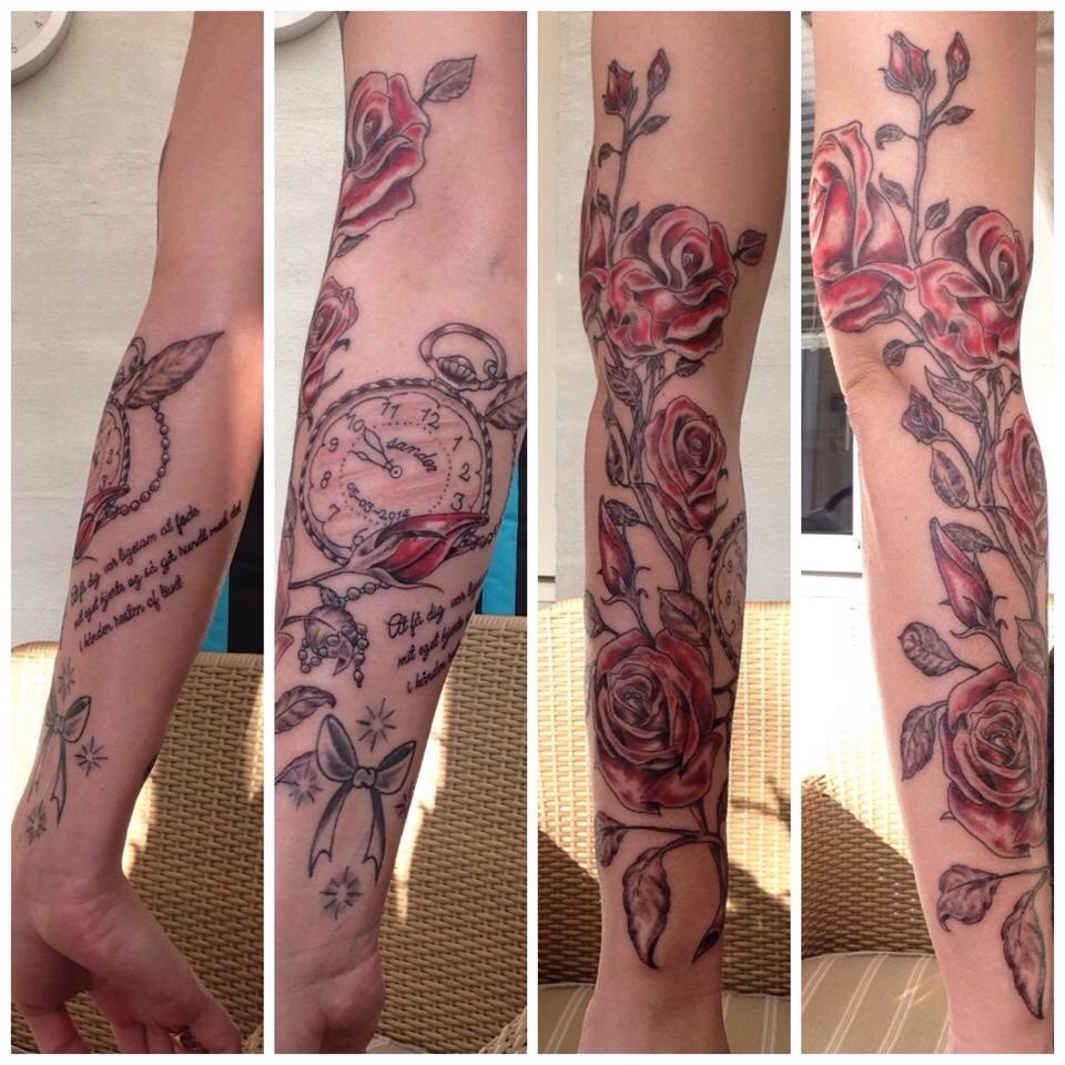 Det er en tatovering der er lavet udfra en masse ideer og er en mindetatovering for min datter Lia. Blomsterne danner hendes navn (kan jeg se) og vikler sig samtidig ind i hinanden som mine 3 børn (nu har jeg så 4), ikke for at tynge hinanden ned men for at blive stærkere og smukkere. Sommerfuglen er et symbol på min datter, de 3 prikker symbol på fortid, nutid og fremtid. Og ja så danner det hele jo et hjerte som symbol på kærlighed....