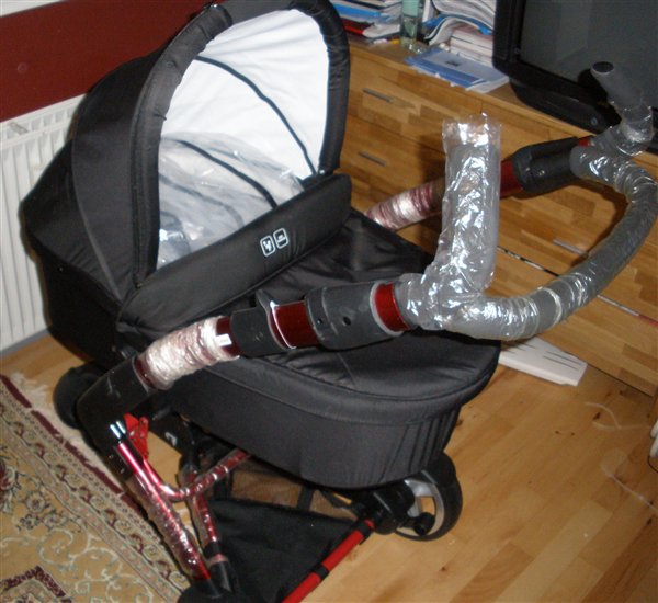 Klapvognssæde og barnevognskasse med liggemål på 75 cm. Styret er både vandret og lodret og kan justeres i højden.