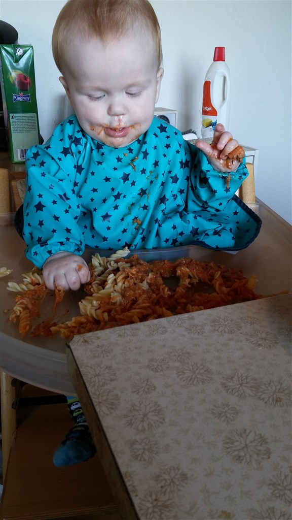 Min yngste er 18 måneder og spiser selv. Han har nok gjort det i nogle måneder.