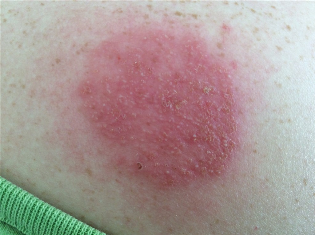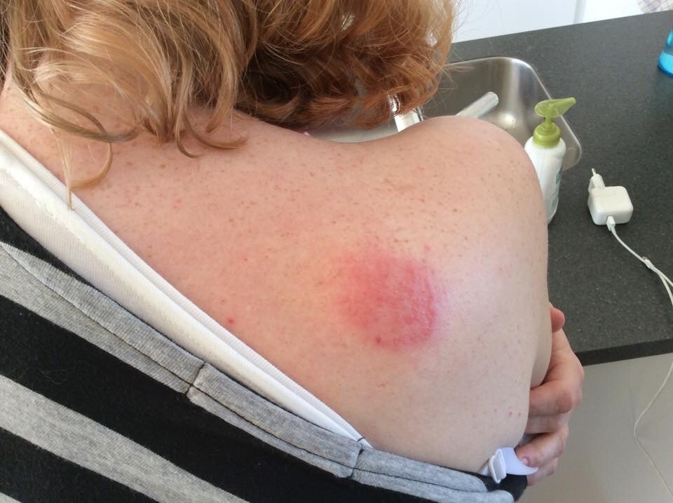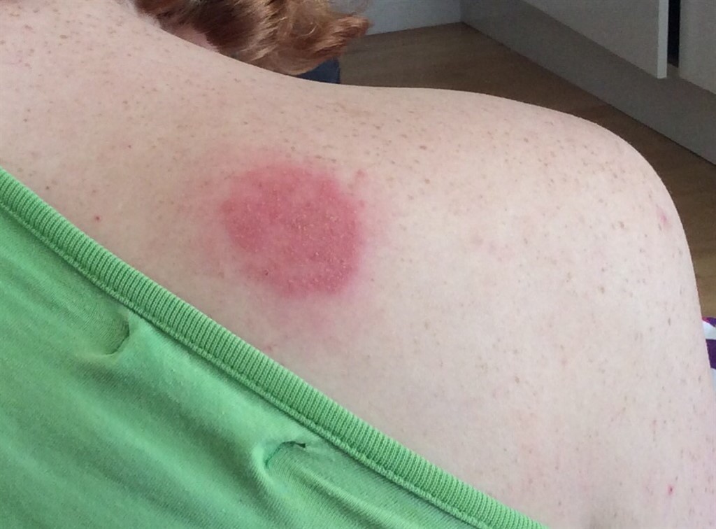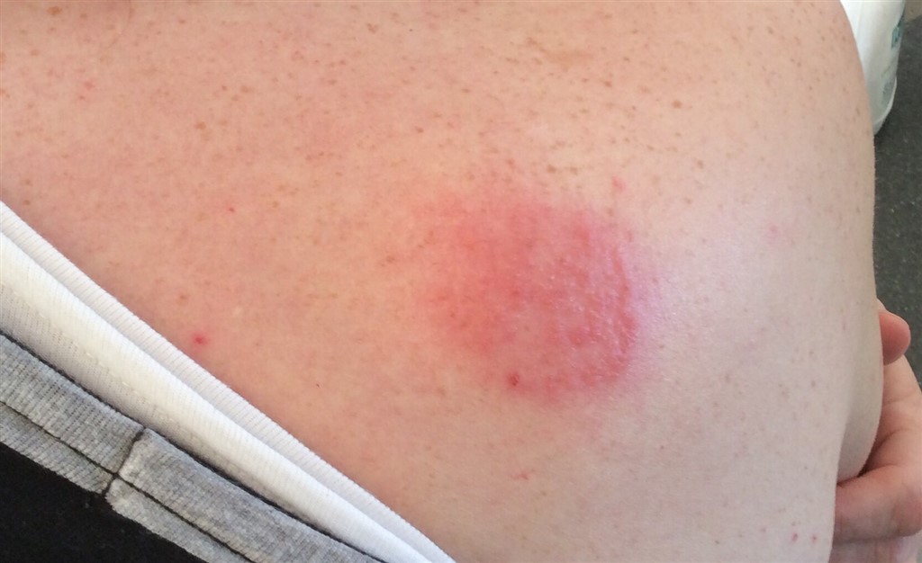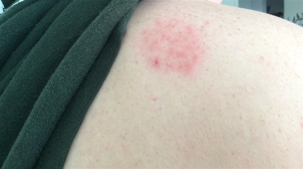 lørdag morgen er udslettet blevet et kæmpe rød plet på skulderen, udslettet har ikke bredt sig det er bare blevet mere og mere rødt.