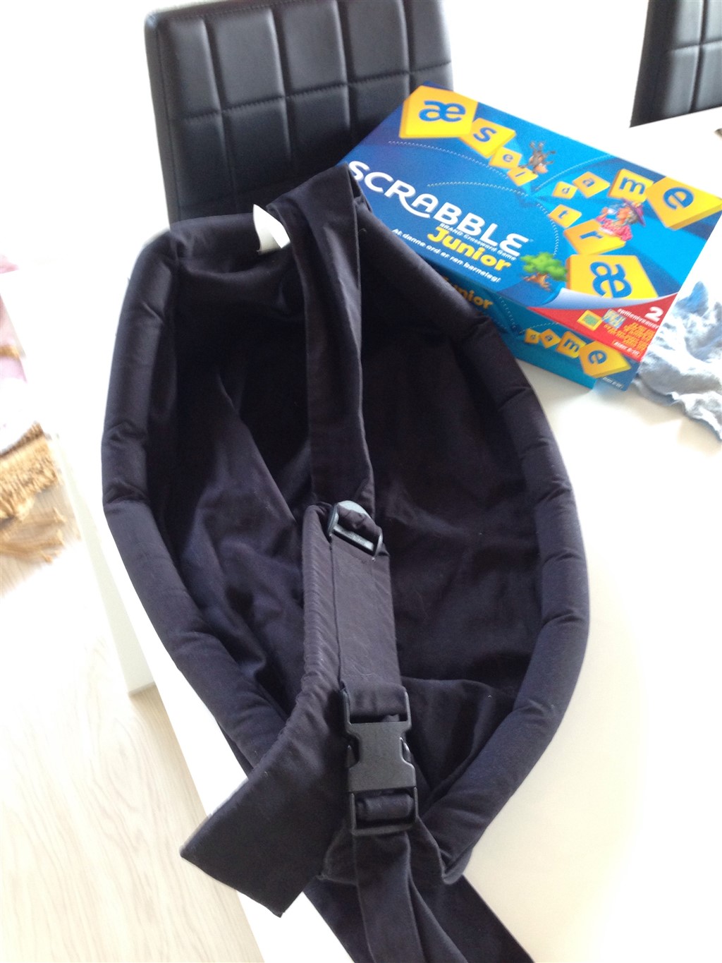 Baby skal sidde ergonomisk korrekt, altså med knæene bukket over numsehøjde!