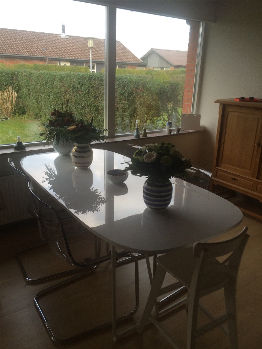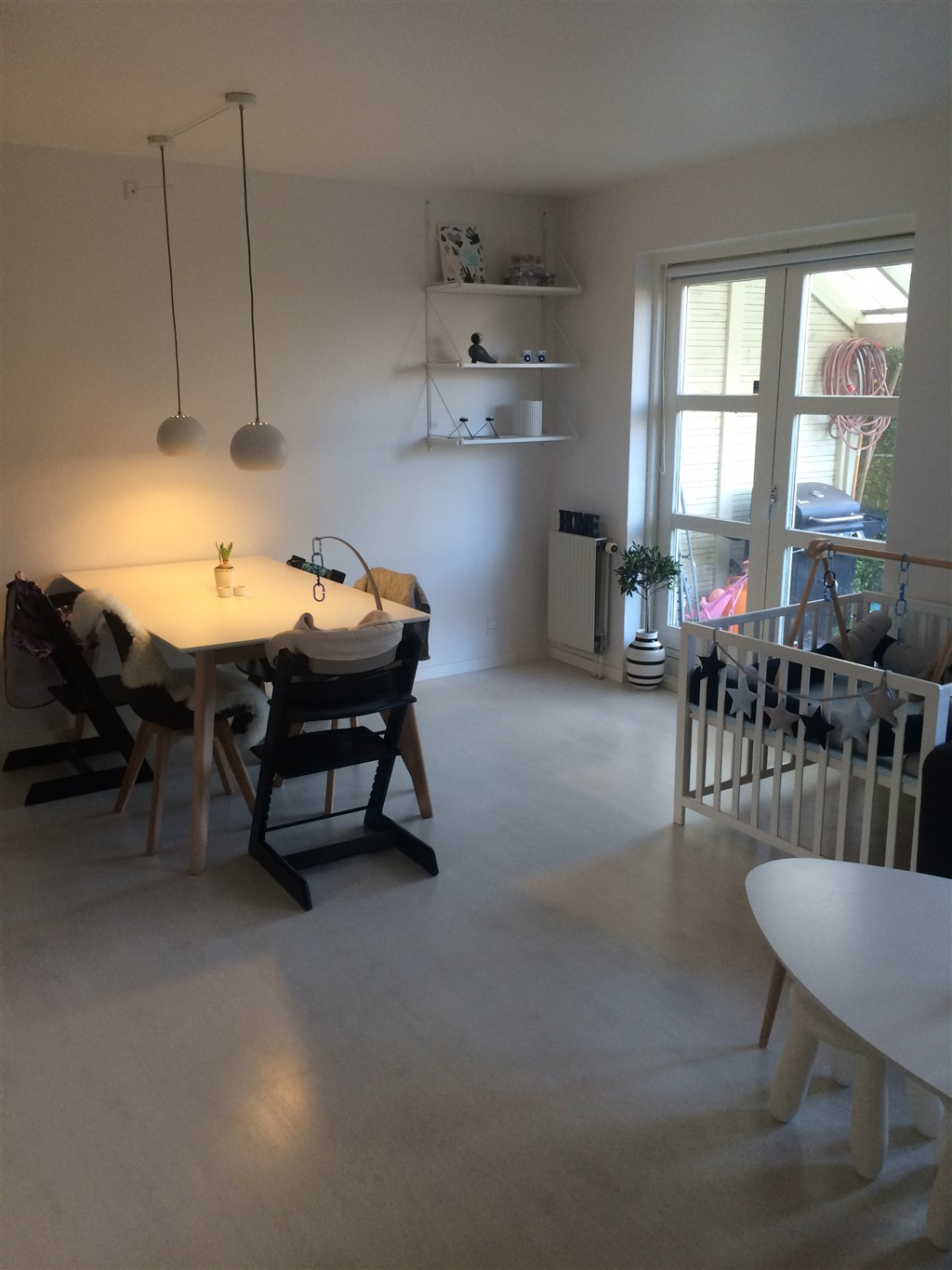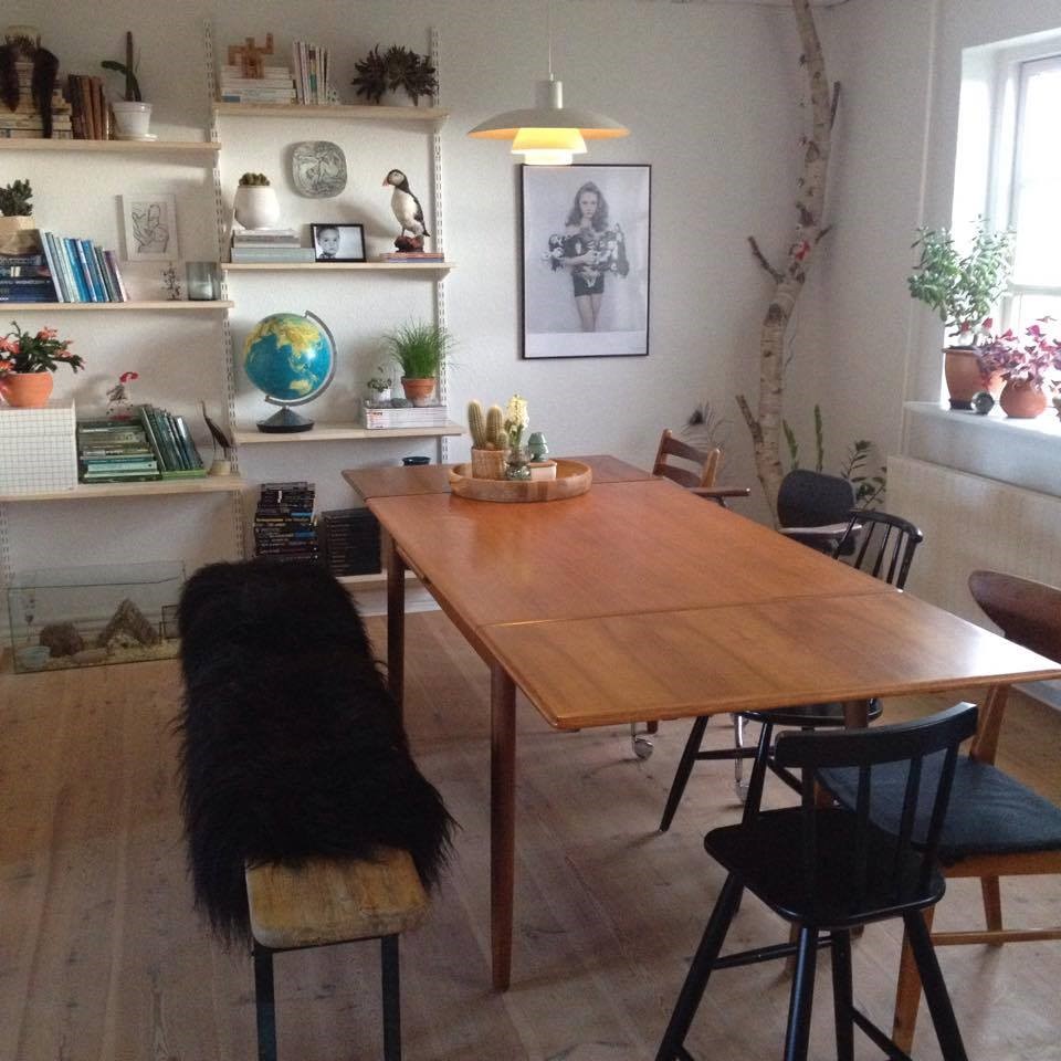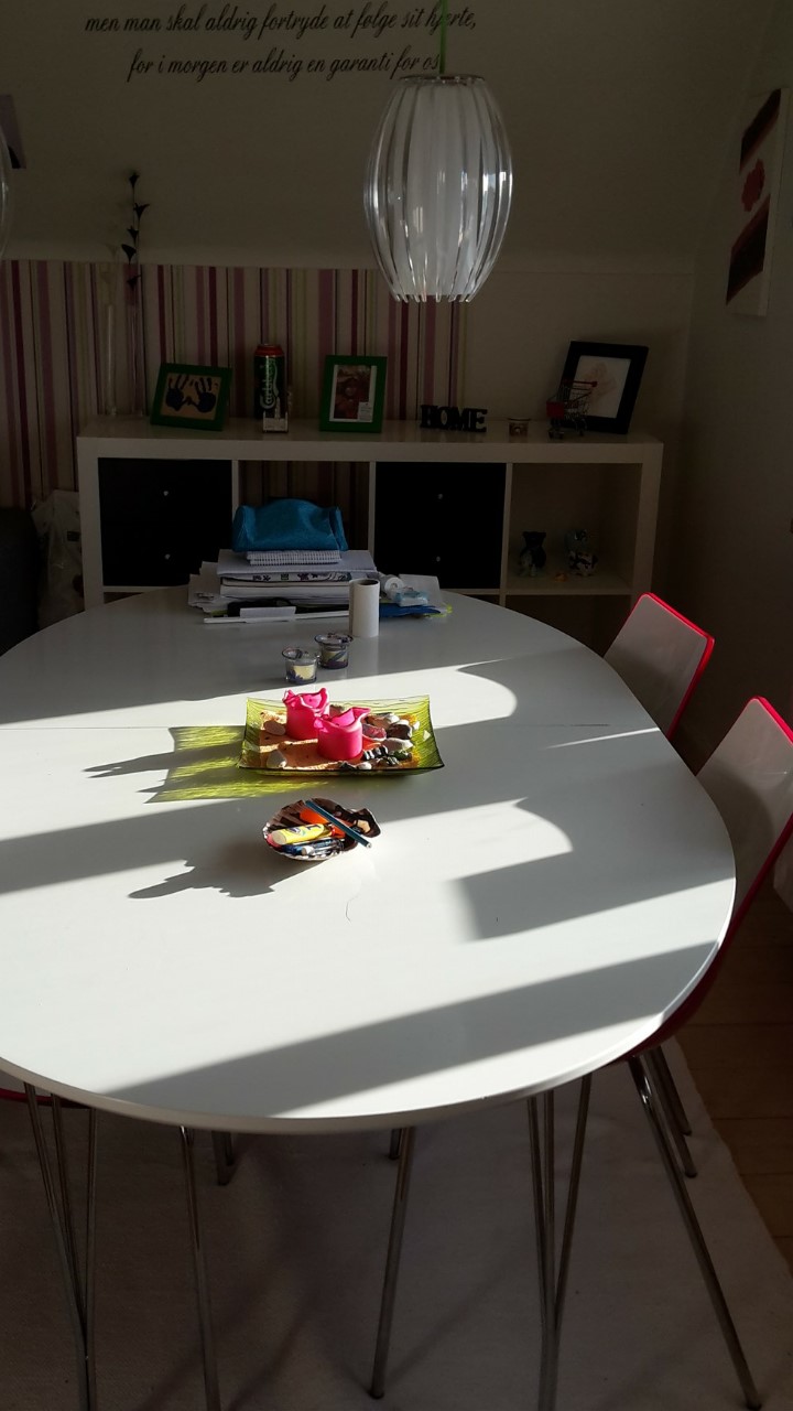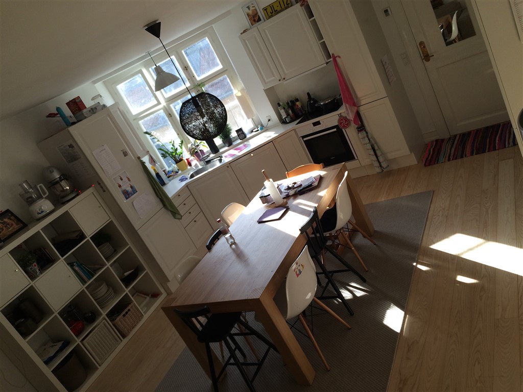 Vores køkken/alrum med spiseplads, som det så ud for nogle måneder siden. Nu har jeg rykket bordet lidt, og vi har fået en sofa/slagbænk/hyggehjørne i det hjørne hvor jeg har taget billedet fra. :-)