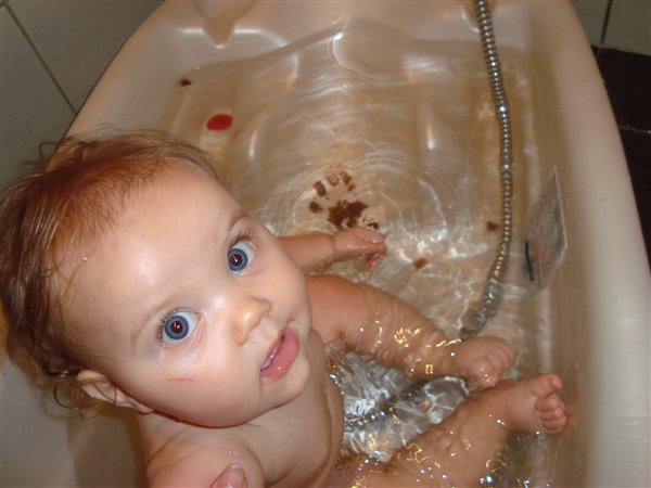 Maya kommer i bad hver aften lige inden sengetid, og her for tre dage siden oplevede vi så for første gang, at Maya lige lavede et par pøller i vandet.. Vi grinede lidt af det - for det er da lidt sjovt på sådan en lidt Yiirrrv måde!