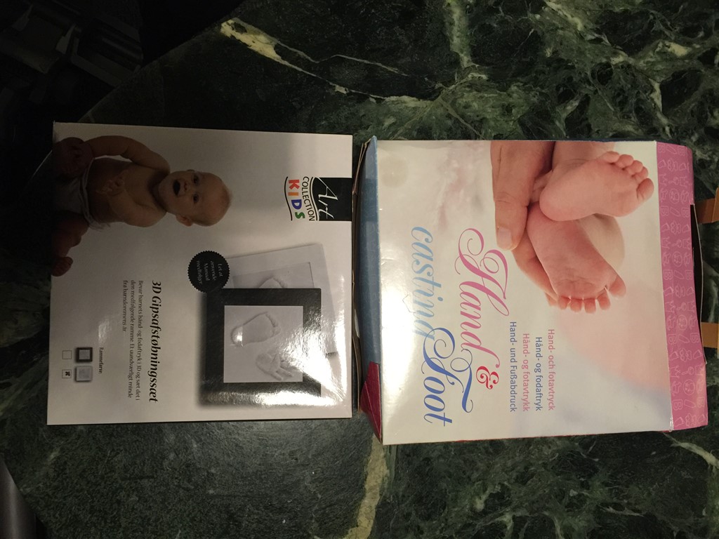 Jeg har disse to gibsafstøbningssæt til fødder og hænder. Der er rammer med og det ene sæt (det lyserøde) har acrylfarver.