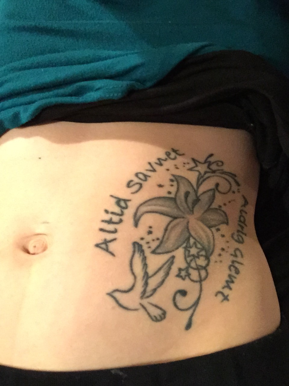 Venstre side af maven - en orkide med en fredsdue, stjerneskud og teksten 'Altid savnet - aldrig glemt'. Til minde om min farfar som jeg mistede i 2011