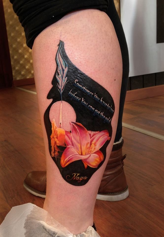 Liljen er for min engel lily og lyset er for dem begge som tegn på at selvom lyset er ved at brænde ud så fortsætter flammen og bliver til en fjer som flyver videre i min datter Naya