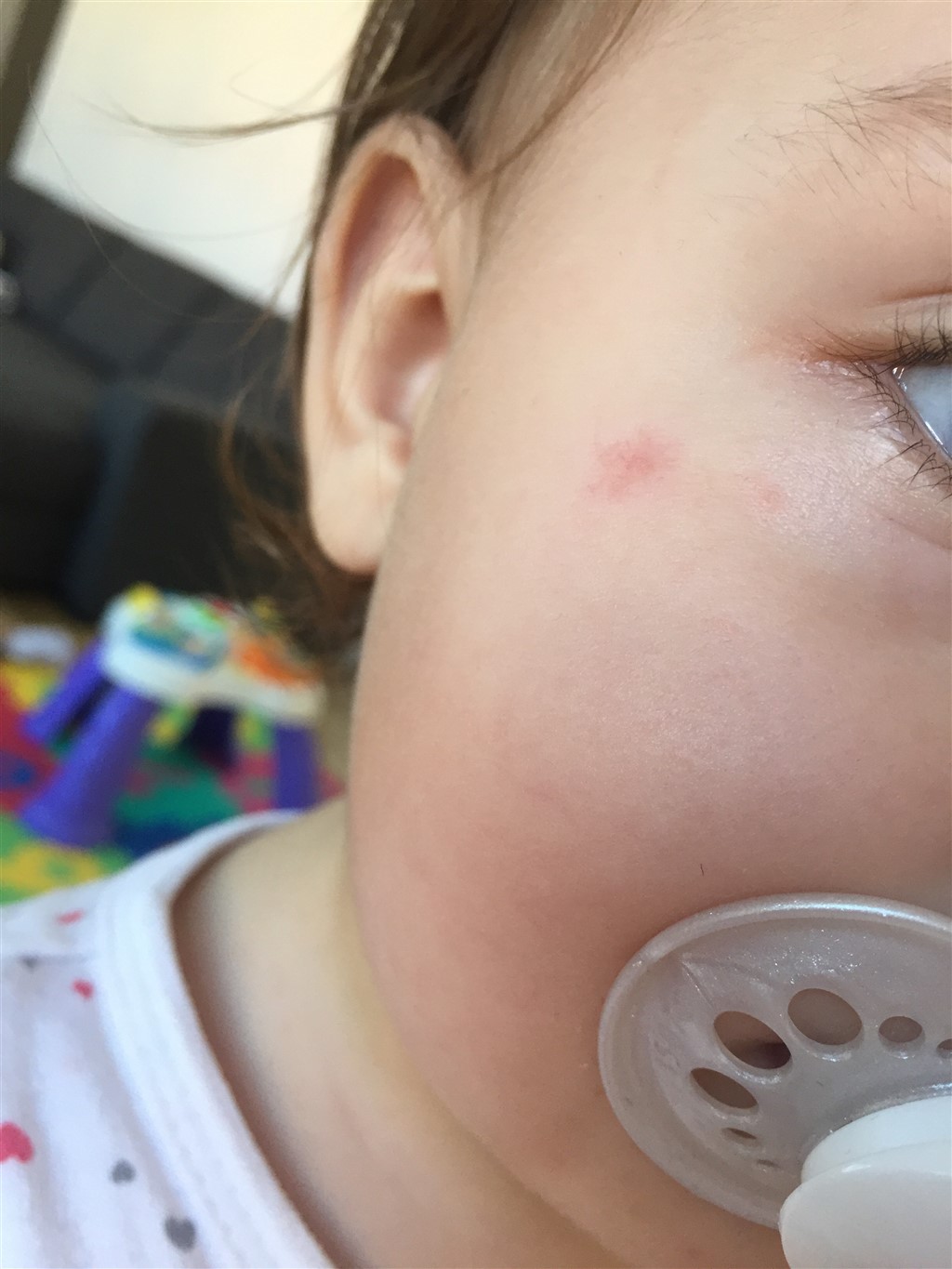 Min datter har et medfødt rødt mærke ved øjet, meget mere tydeligt end din datters. Der har vi fået af vide, vi kun skal reagere hvis det begynder at hæve op/vokse udad.