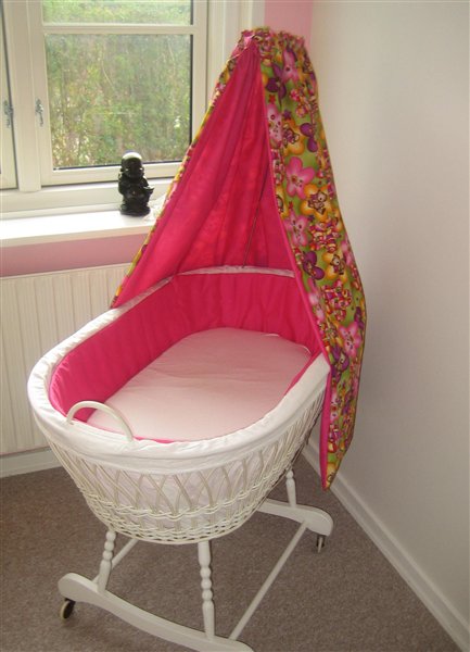 Men den har sgu altid været lidt kedelig, med hvidt betræk med blå og røde blomster (så begge køn kan bruge den) - Men denne gange da jeg fik den hjem, tænkte jeg, at jeg ville shine den lidt op, og har derfor syet en sengerand og en ny himmel.