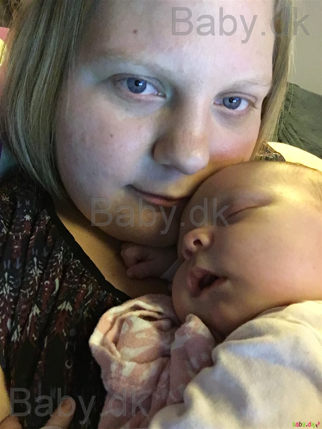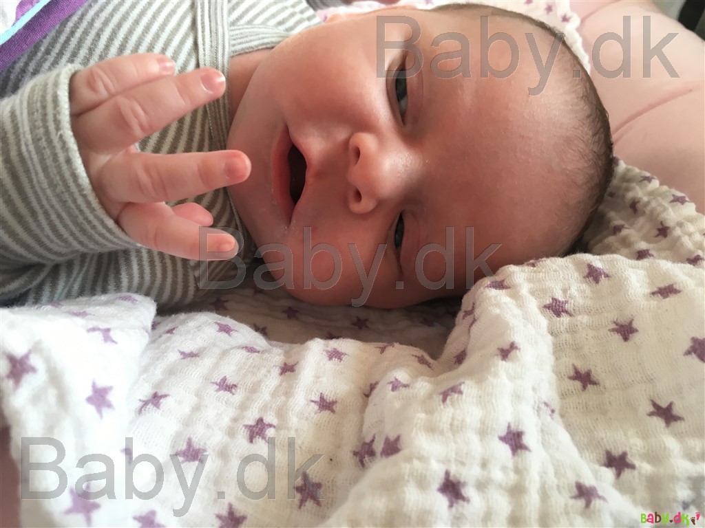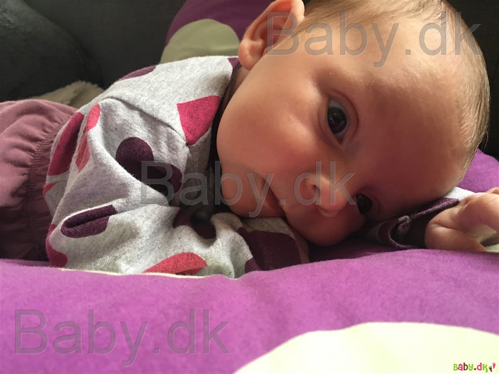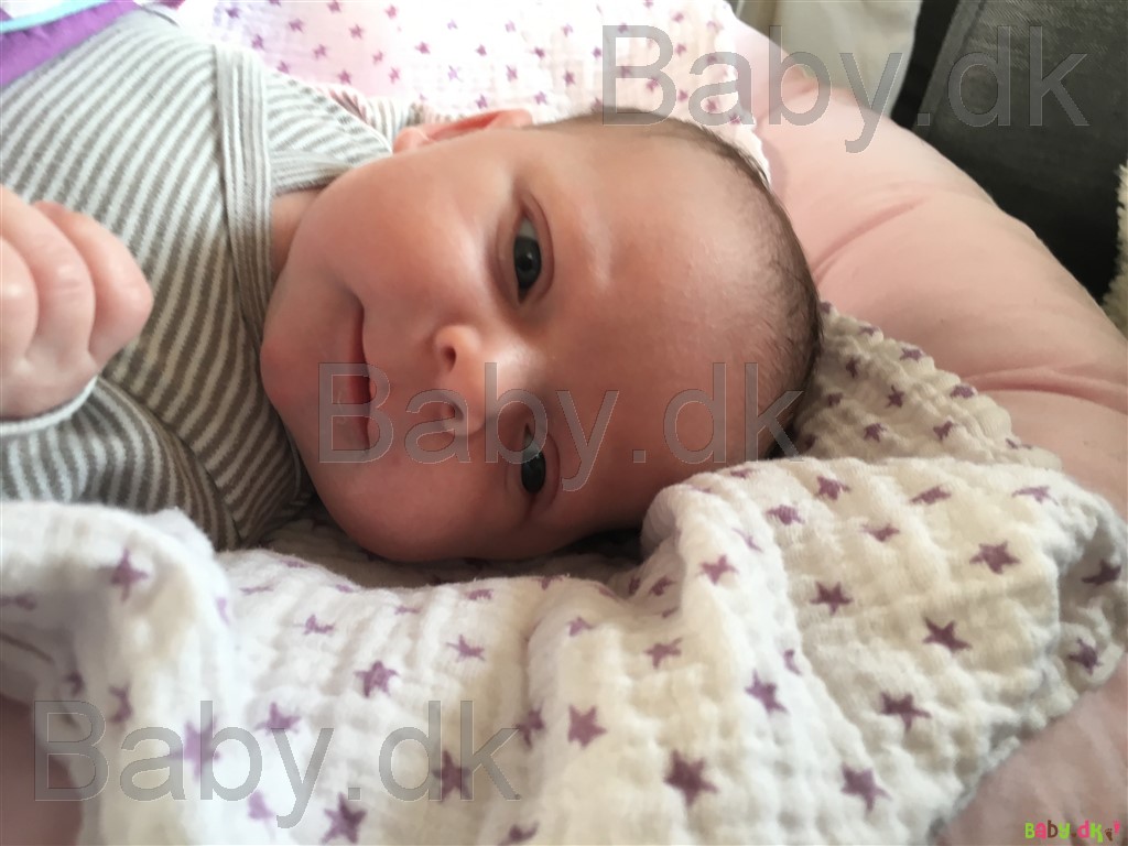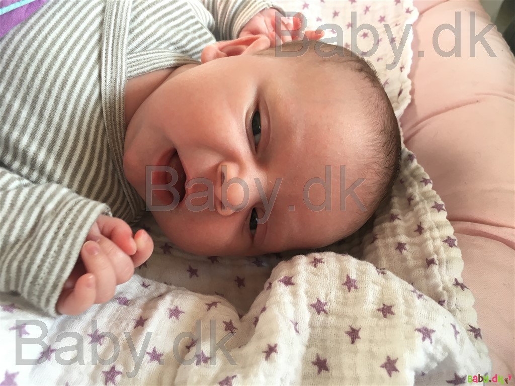 Hun er så dejlig nem og glad. Hun sover i gennemsnit 4 timer af gangen, græder kun når hun er sulten og i hendes vågne timer er hun smilende og nysgerrig