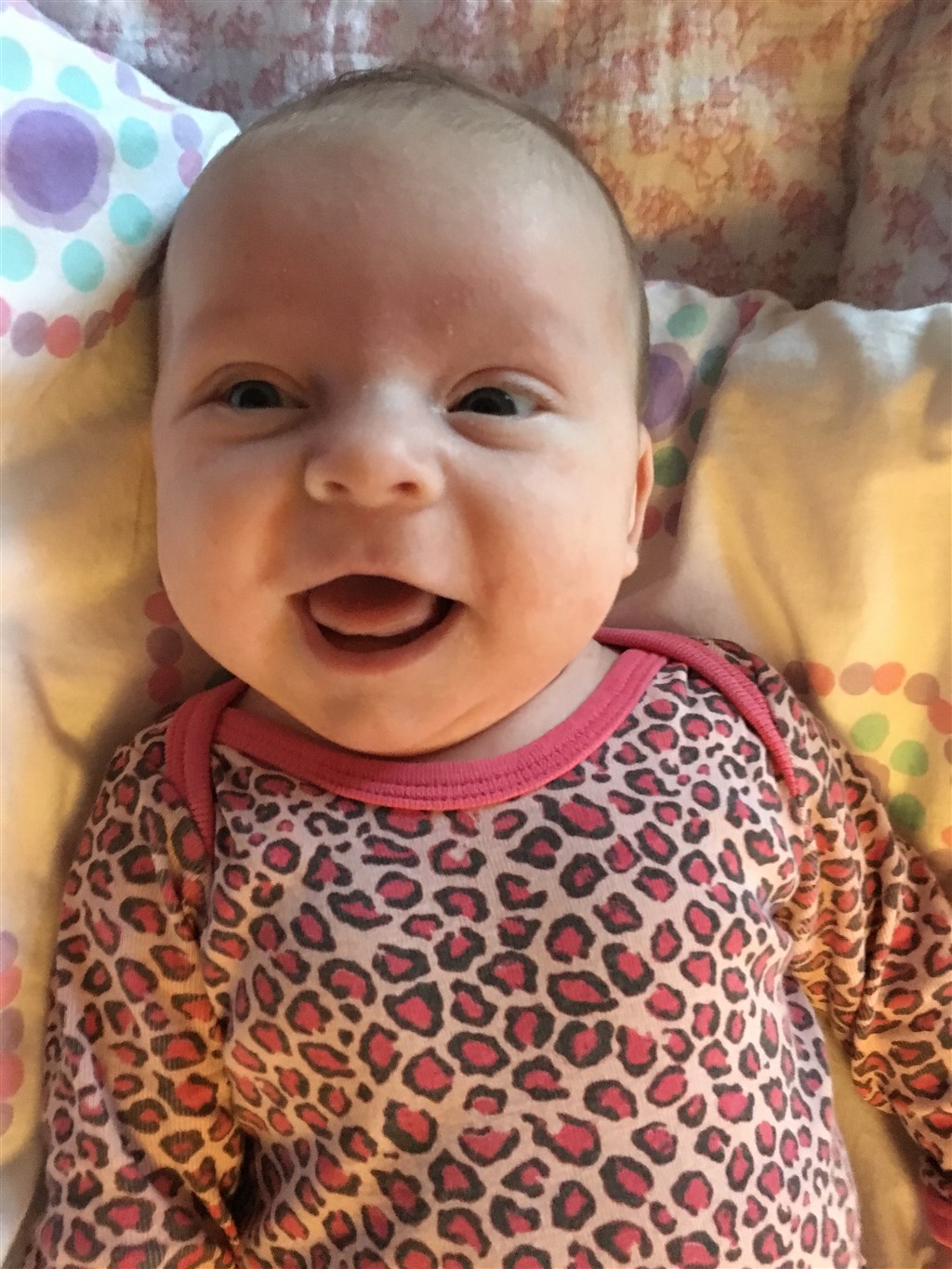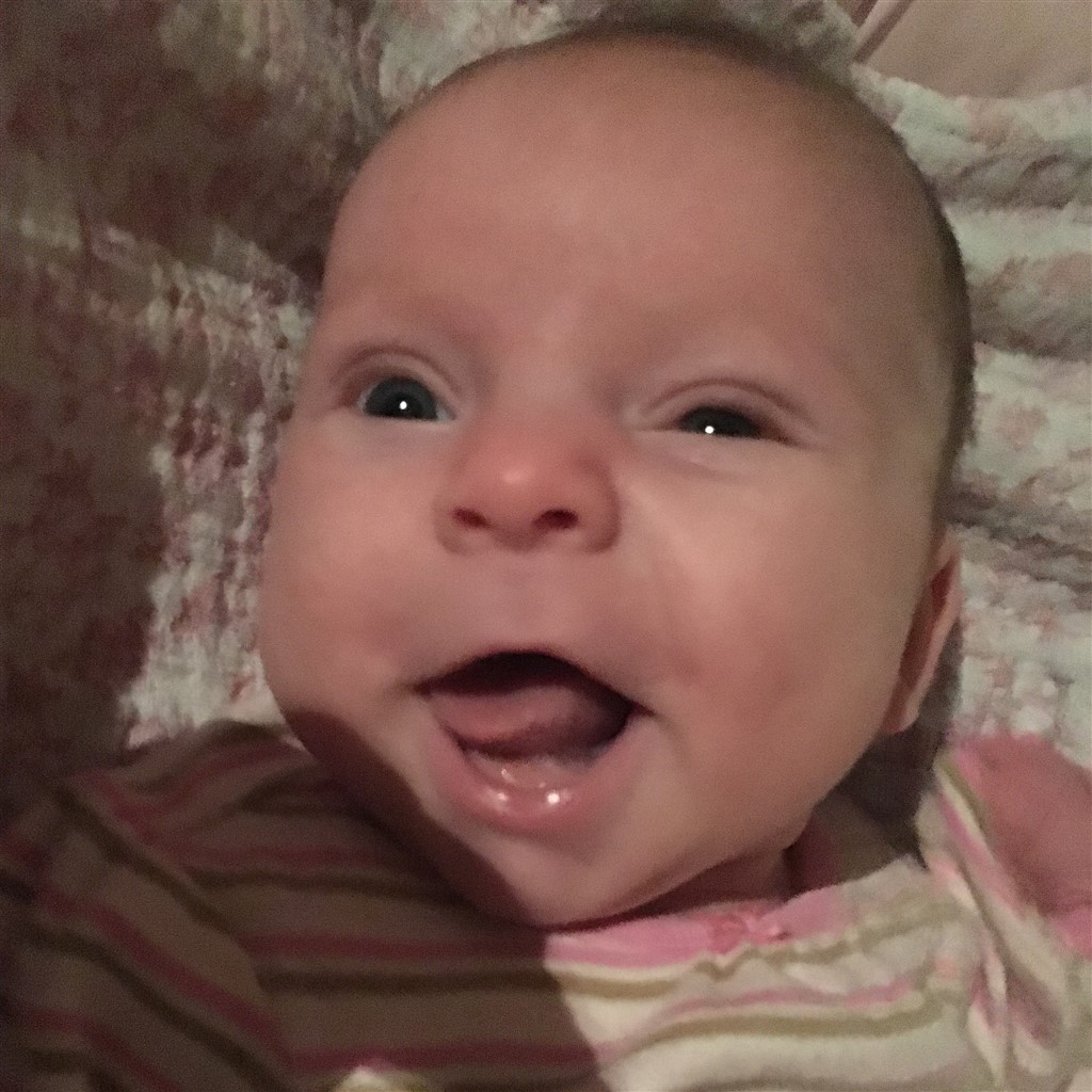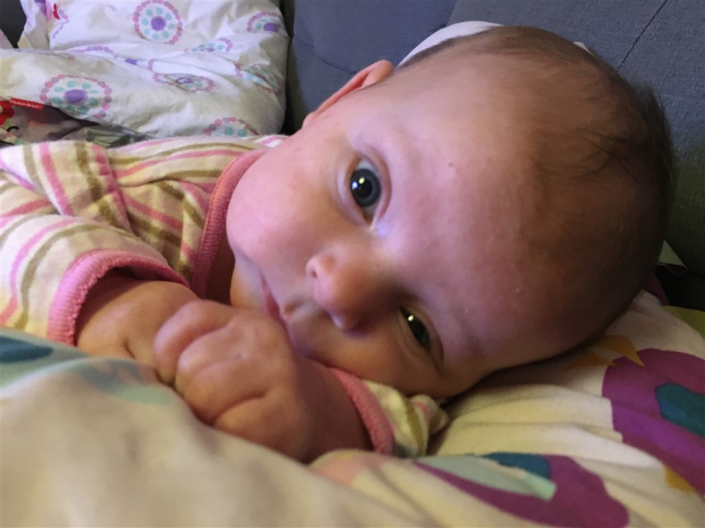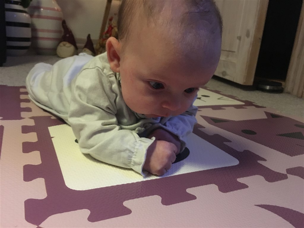 Hun er stadig mild, nem og næsten konstant smilende dog meget kræsen (hvis man kan være det i den alder) og går tit træt i erstatning og så må vi skifte til noget andet i 2-3 uger for at gå tilbage til det første når hun bliver træt af det andet. Hun sover fra midnat til kl. 5 og gerne igen fra kl. 6 - kl. 10, så jeg klager ikke