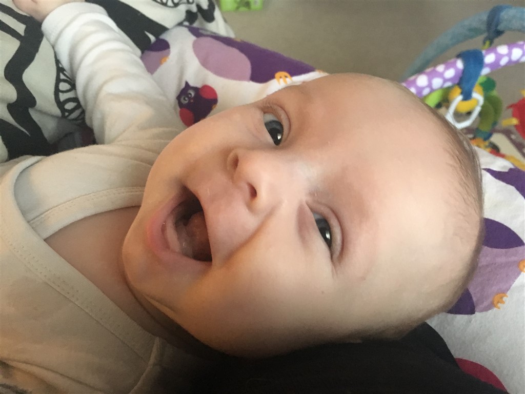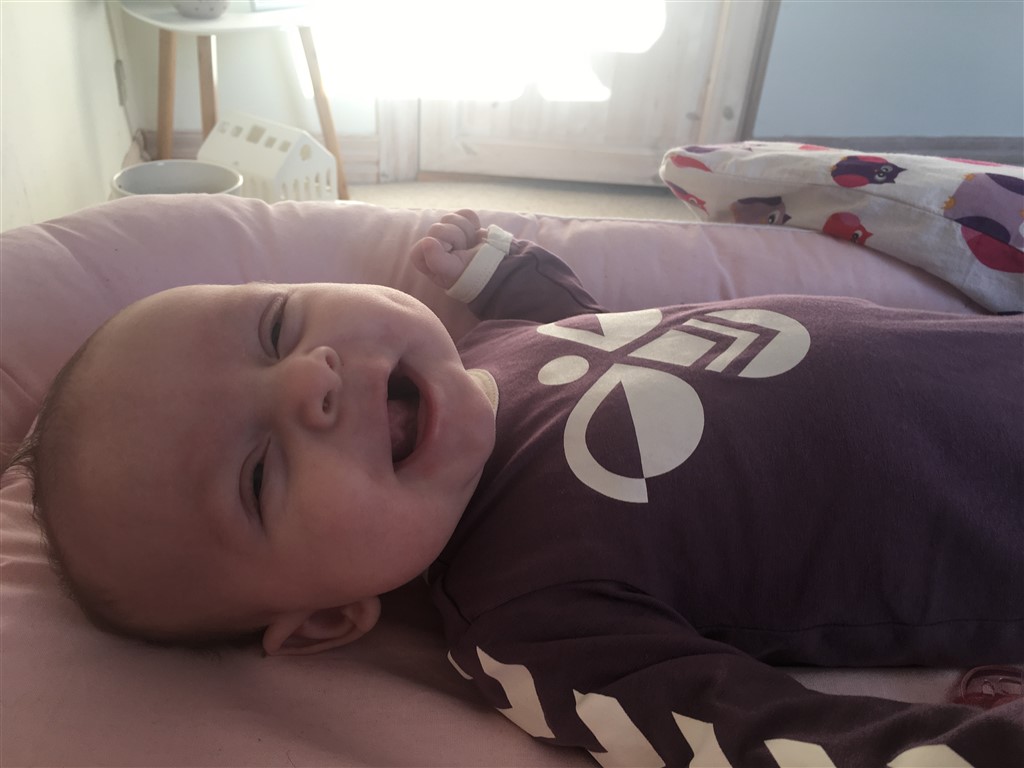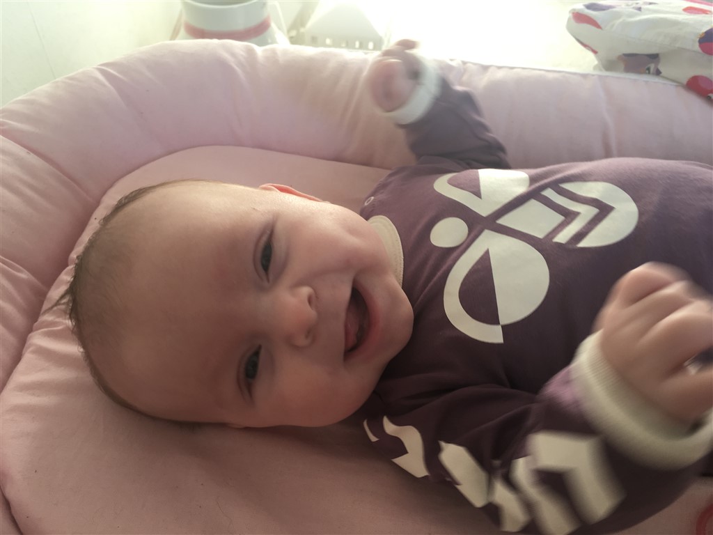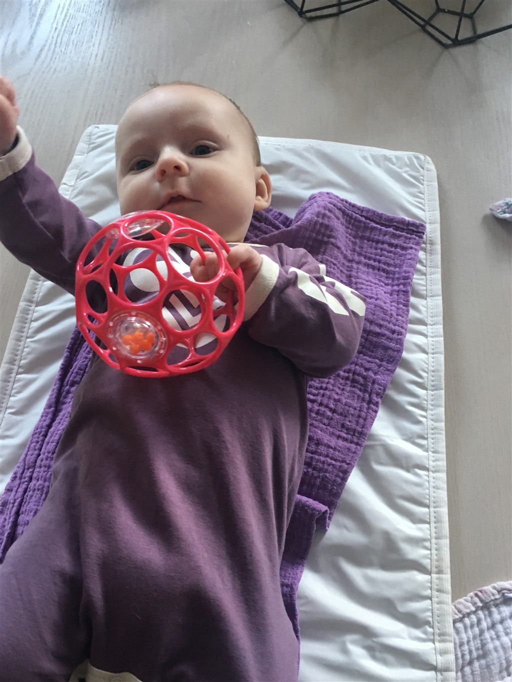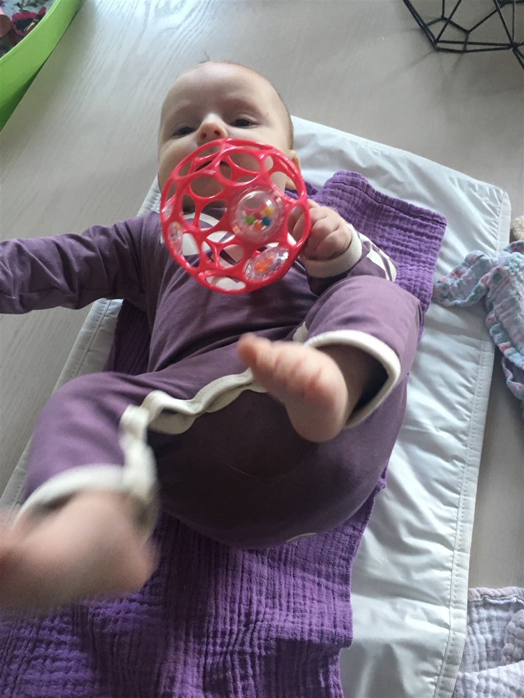 Hun elsker sit legetæppe og kan ligge i lang tid og fortælle tigervennen en masse historier. Hun pludre løs til alle og enhver, hun griber fat i ting og propper alt i munden - hun er bare så godt med udviklingsmæssigt