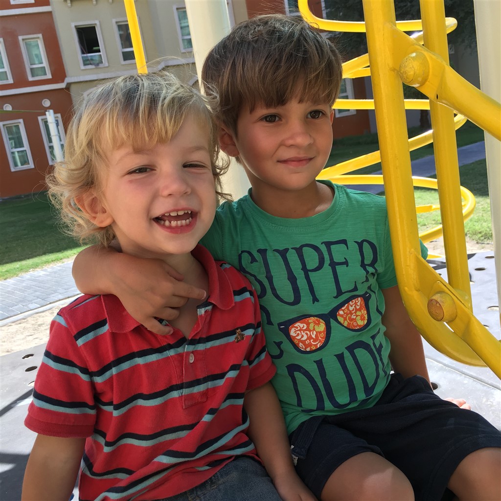 Min ældste har mørkebrunt hår og næsten sorte øjne, min yngste har mørkt ravfarvede øjnene og en smule lysere hår. De er begge født med helt lige hår, men den ældste er ved at få lidt krøl i enderne. Og så har de begge store fødder