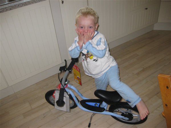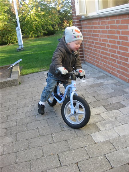 Han har fået en Puki løbecykel af os og den er bare et stort hit. Han kan godt finde ud af den, men det går lidt langsomt endnu