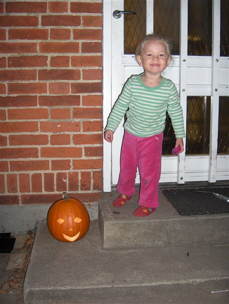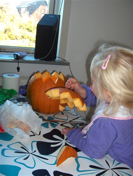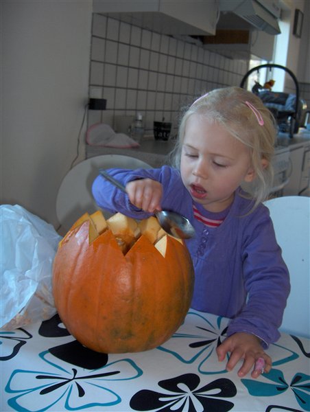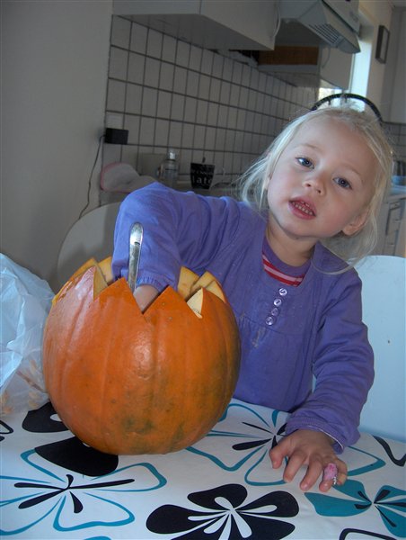 Vi må bide skammen i os, for vi har nu officielt et græskar stående udenfor vores dør som det ENESTE hus i hele bywen indtil videre!