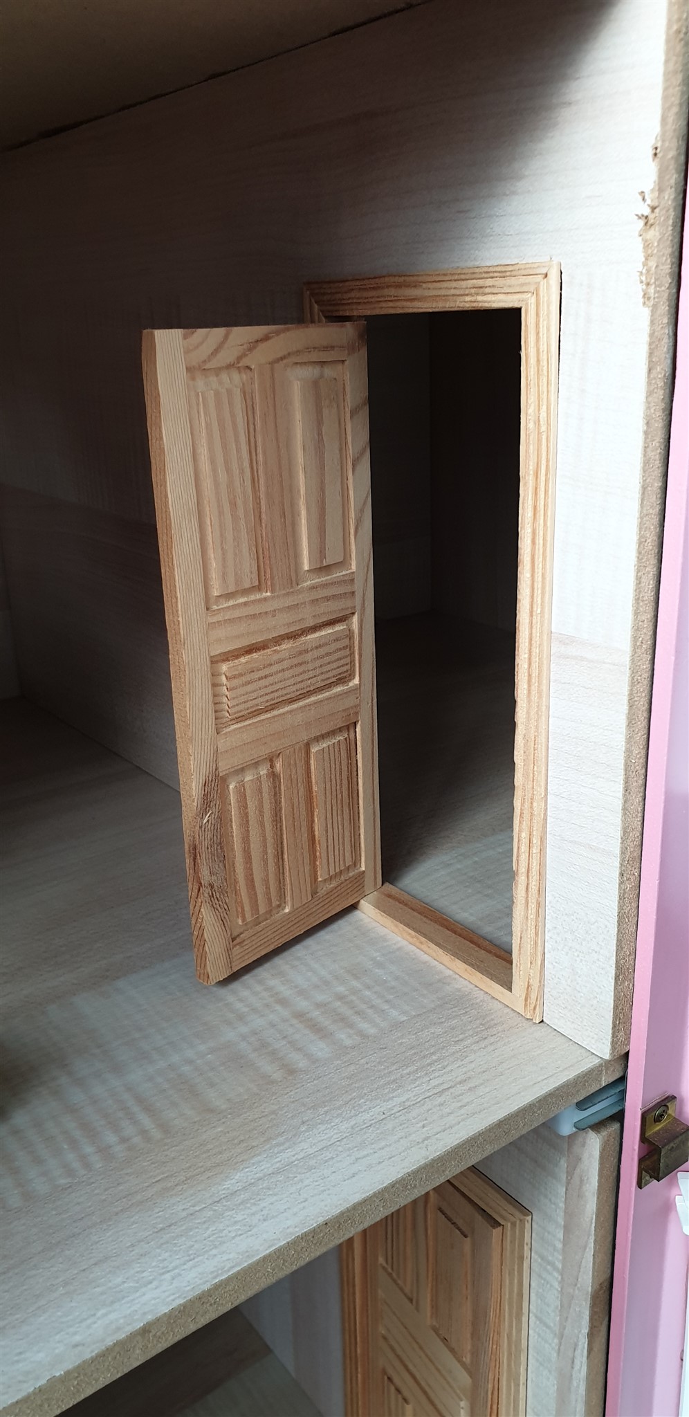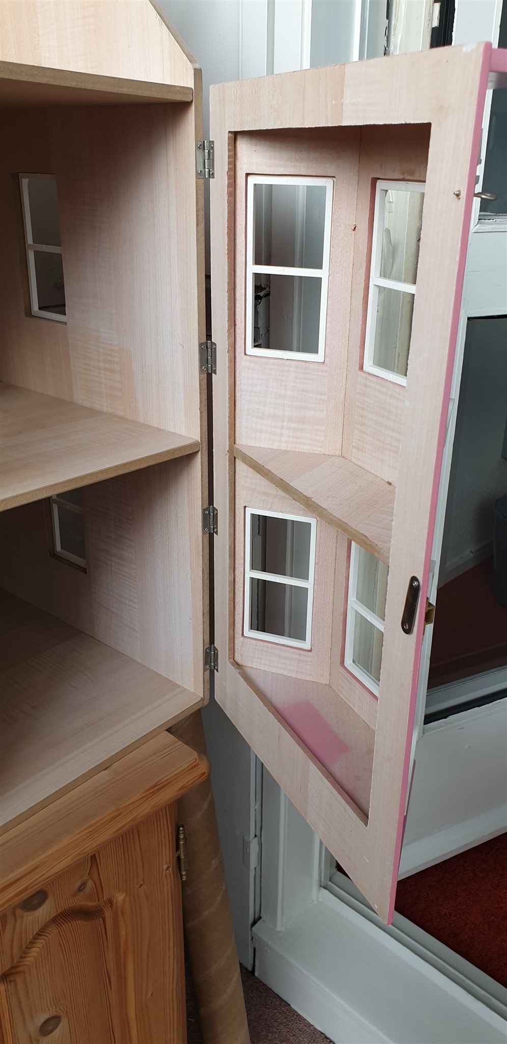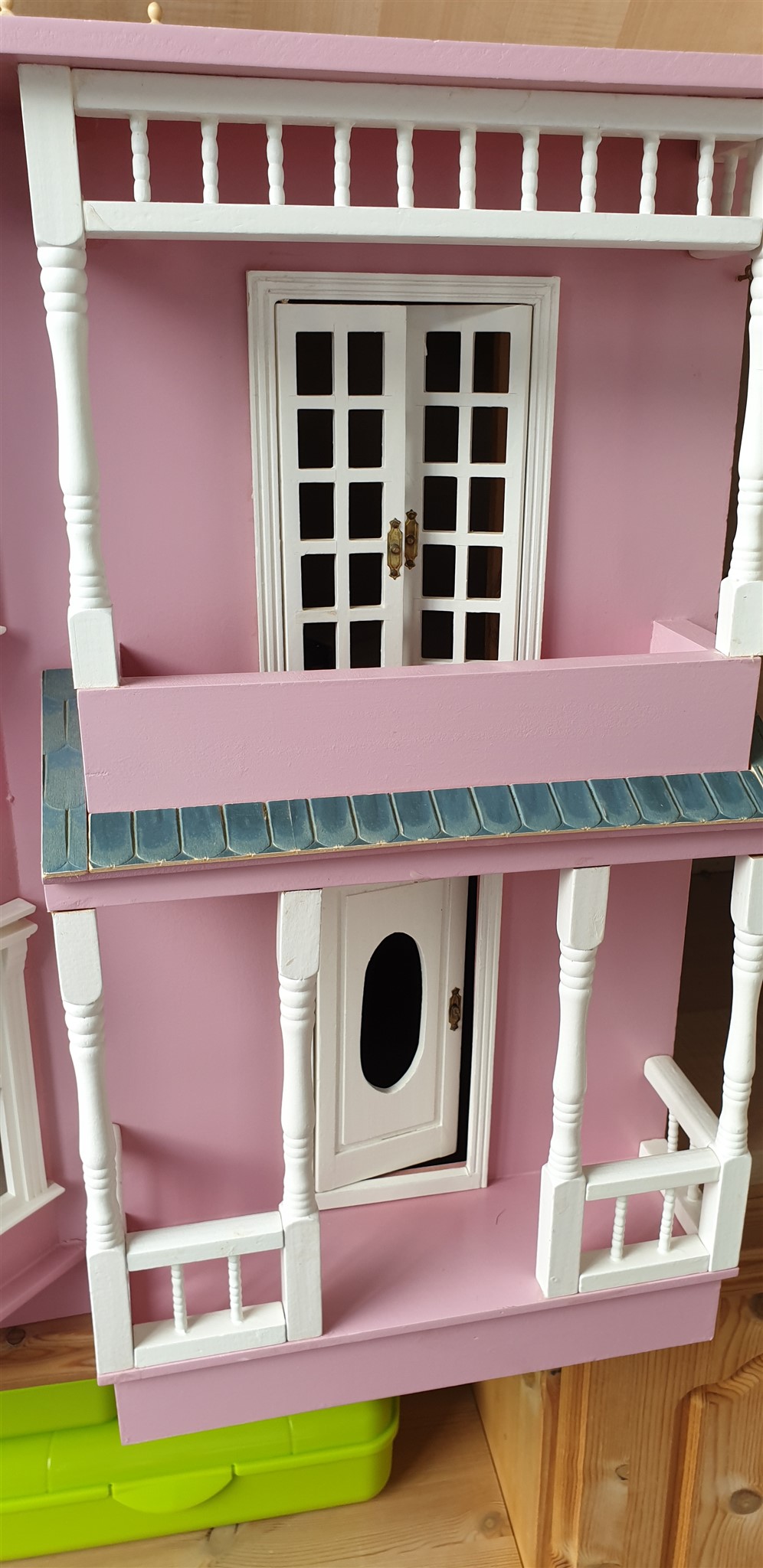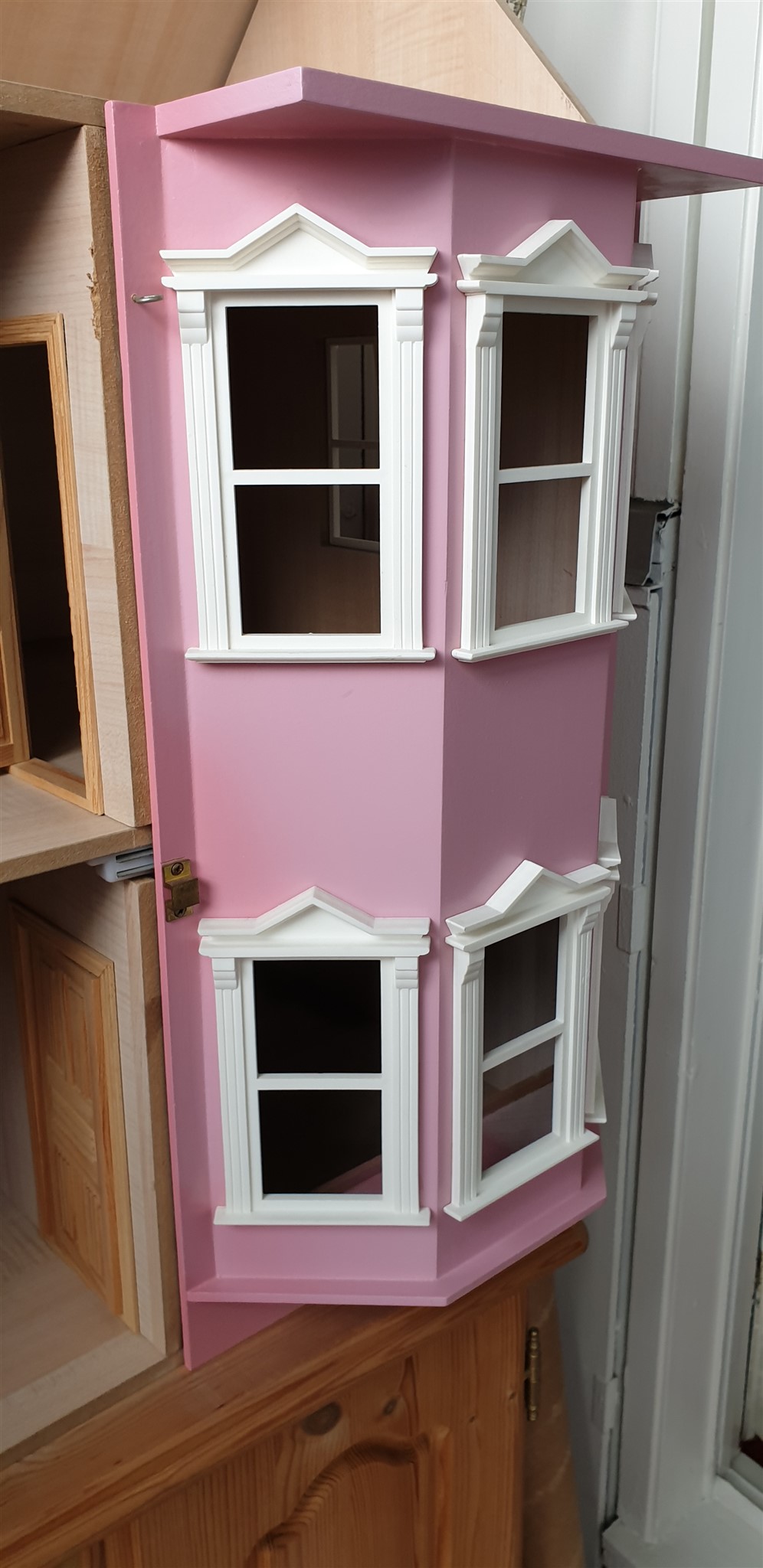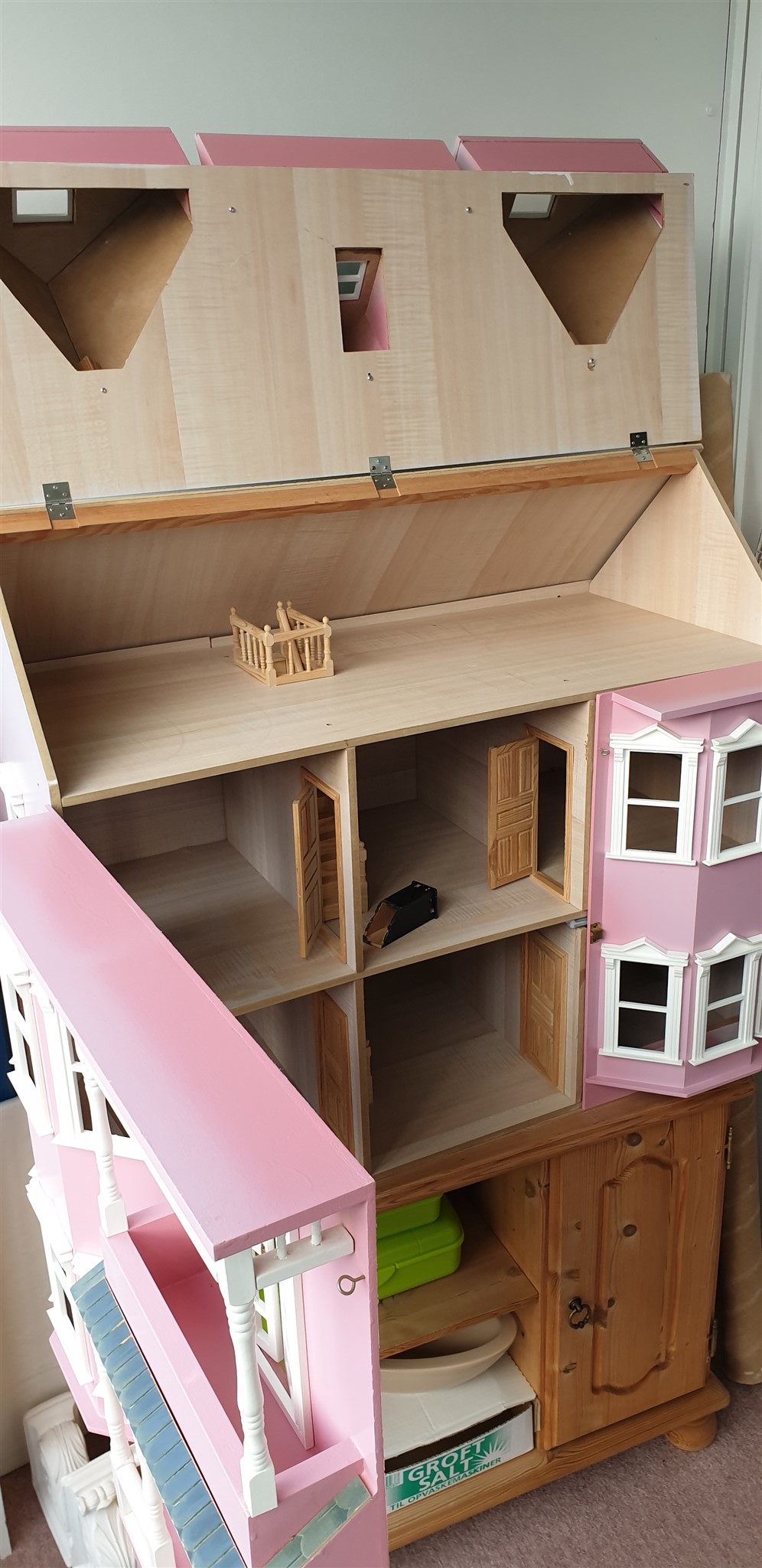 Super flot dukkehus i farven gammelrosa.Alt er håndlavet og med rigtig mange fine detaljer.For eksempel trapper og døre.3 etager hvor hele loftet kan åbnes.Huset er lavet med flotte messing beslag.