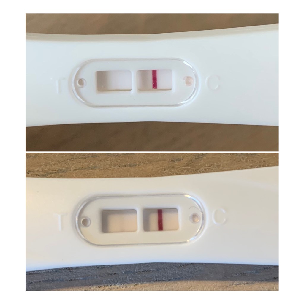 Jeg har aldrig før haft antydningen af en ekstra streg på en graviditetstest og er derfor lidt på bar bund her... Kan denne test mon være positiv? Der er en svag lyserød streg - lidt sværere at se på billedet end i virkeligheden.